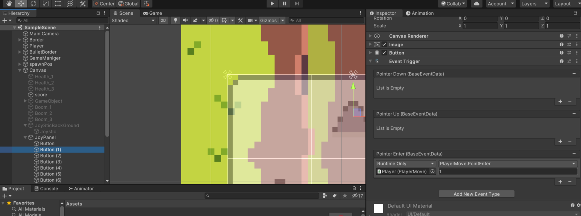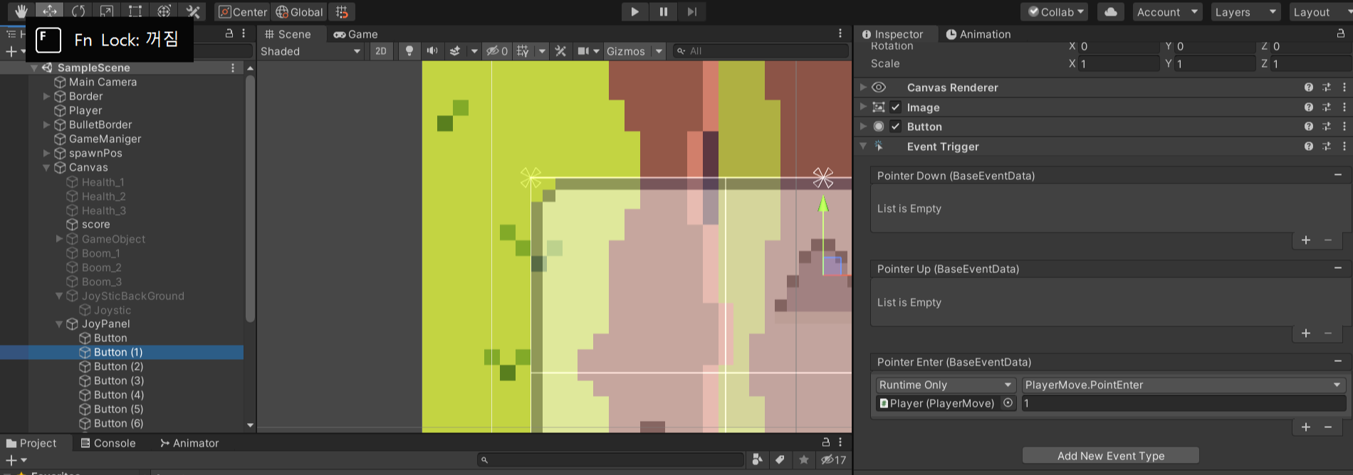 - 9개의 Button중 한개의 Button의 인스펙터창에 Event Trigger를 추가해주고 Pointer Down, Pointer Up, Pointer Enter