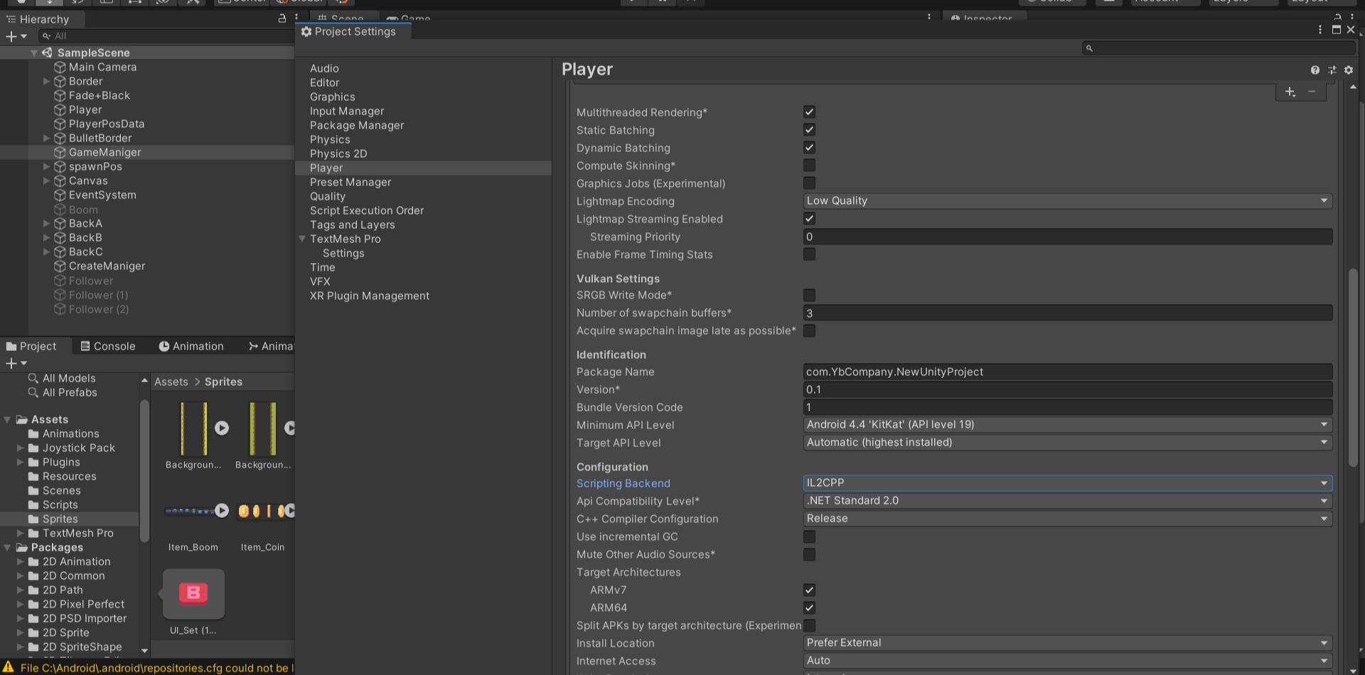 4)pakage Name의 company이름을 바꿔주고, Scripting Backend를 IL2CPP로 바꿔준 후