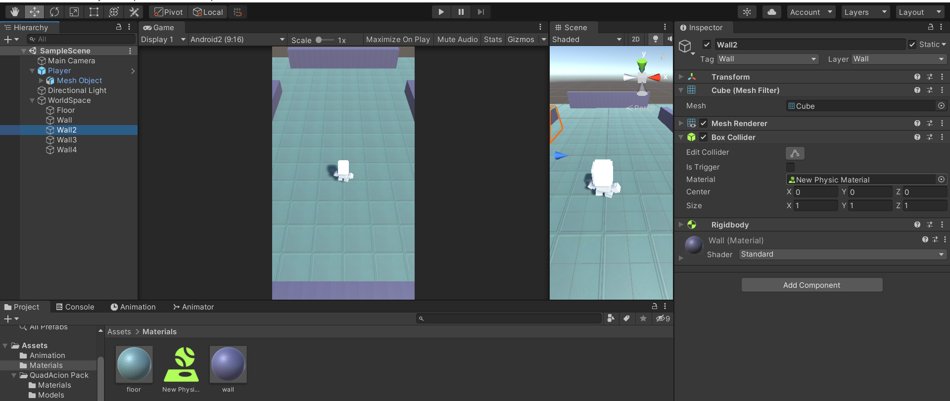 - physic material 를 생성하여 마찰과 탄성을 0으로 만들고 마찰결합도 최소로 만든 후 벽 오브젝트에 드래그 앤 드랍