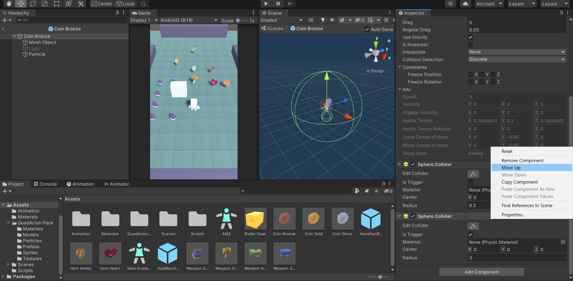 * 하나의 오브젝트에 콜라이더가 2개인경우 GetComponent<>()를 하면 해당 오브젝트의 콜라이더중 상단에 있는 콜라이더의 컴포넌트를 가져온다(프리팹에서 이 콜라이더 컴포넌트의 순서를 조절하려면 open prefab을 열고 올리고 싶은 컴포넌트를 move up 해준다)