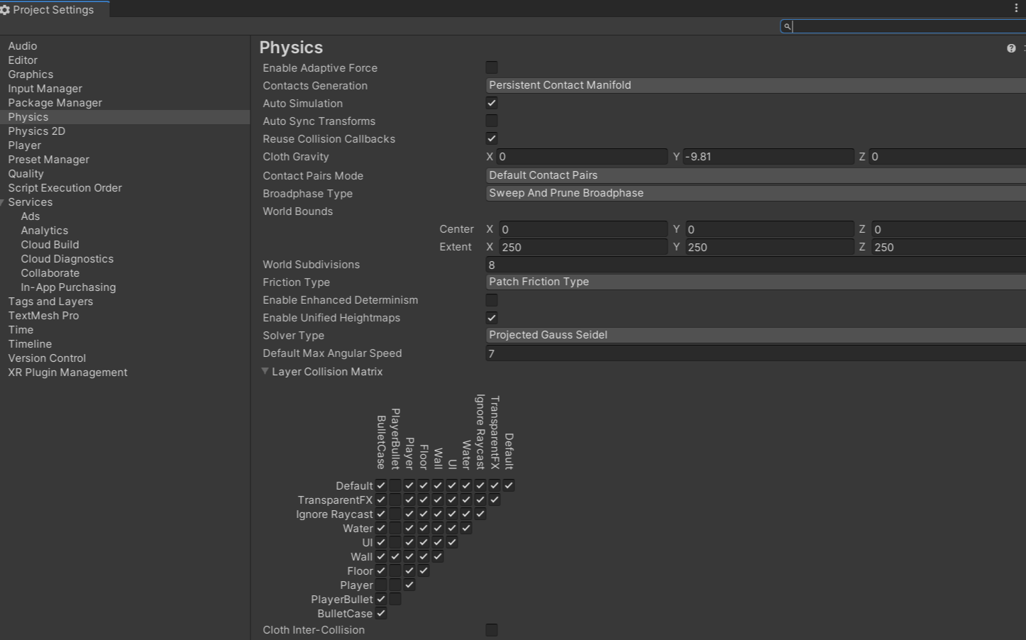 - Edit - Project Settings - Physics에서 각 충돌관계 그래프에 체크해제를 해준다(콜라이더와 관련된 충돌, 트리거 모두 무효화 시켜줌)