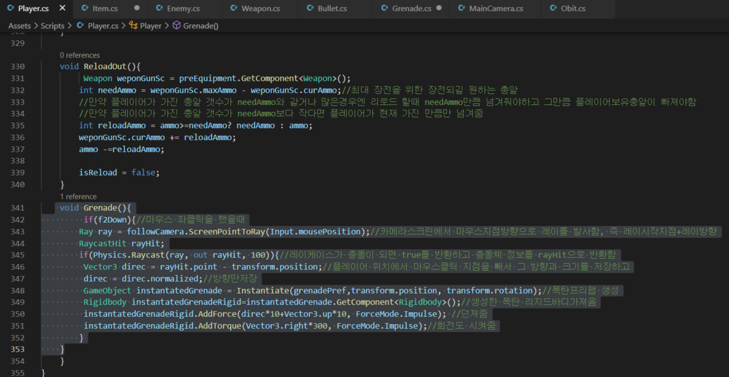 : 수류탄은 플레이어 위치에서 생성(폭탄프리팹 instate)되어, 마우스 우측 클릭한 지점(fire2)을 향하여(dirvec = 우클릭지점 - 플레이어위치) 폭탄을 던질 것(리지드바디포스)