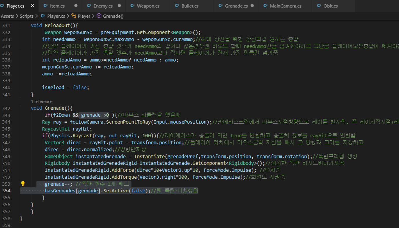 : 수류탄은 플레이어 위치에서 생성(폭탄프리팹 instate)되어, 마우스 우측 클릭한 지점(fire2)을 향하여(dirvec = 우클릭지점 - 플레이어위치) 폭탄을 던질 것(리지드바디포스)
