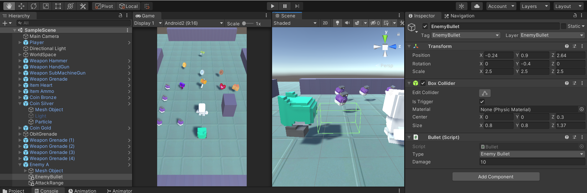 - Bullet 스크립트에서 enum Tpye 을 추가하여 플레이어총알과, 적총알 2개로 나뉘게 만듬