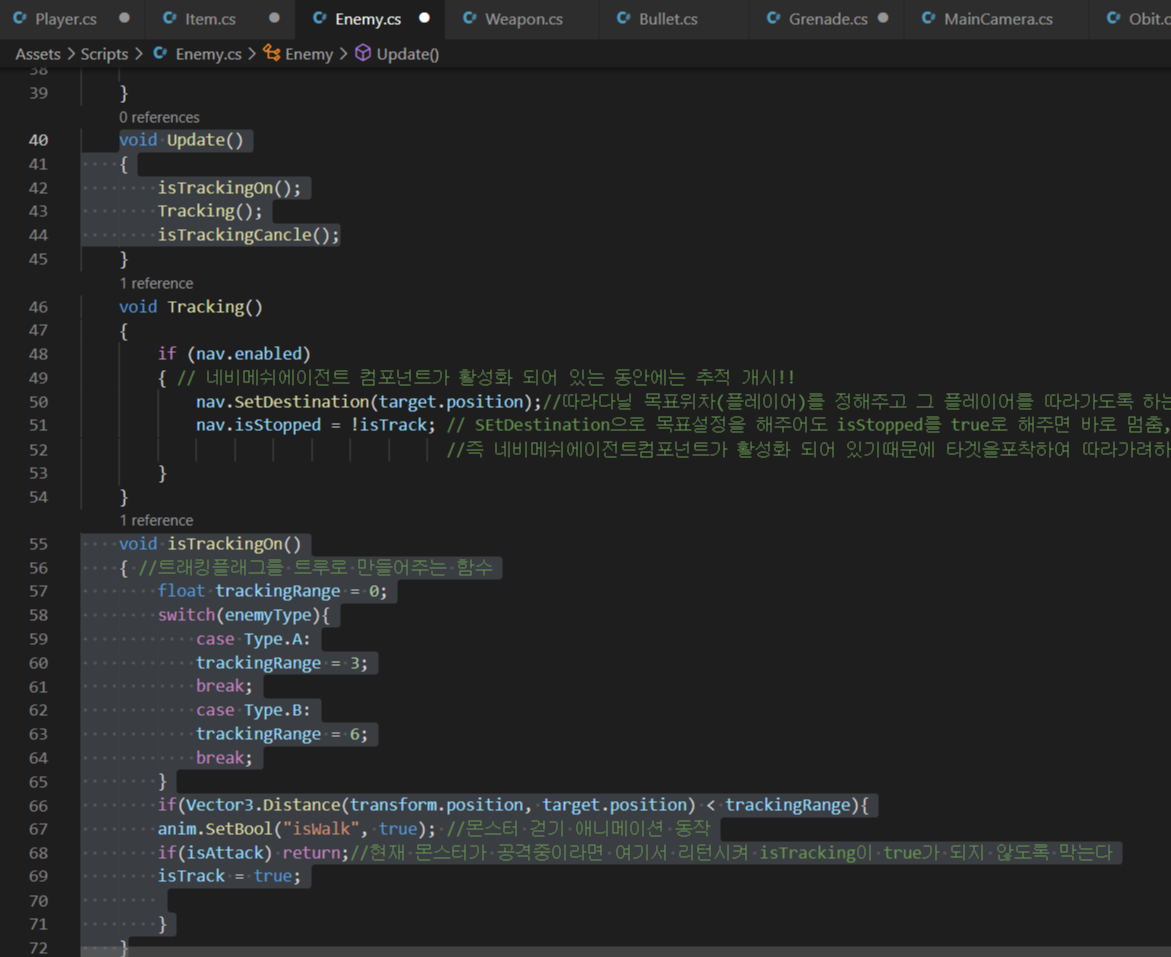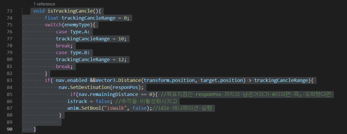 - 플레이어가 몬스터로 부터 일정거리 떨어지면 Tracking을 취소하고 몬스터가 다시 원래자리로 돌아가도록 구현