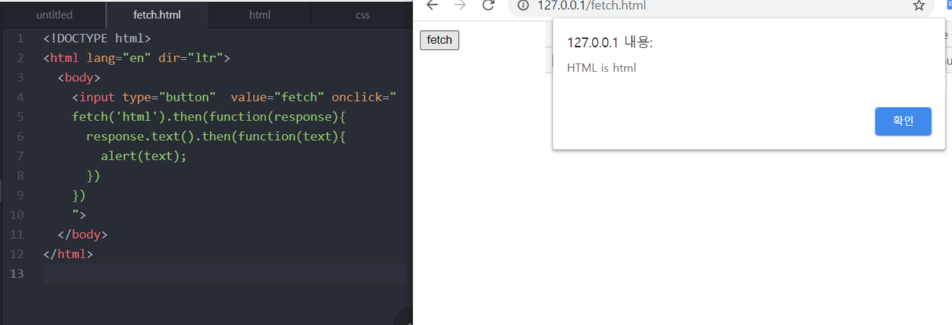 fetch('html')에 의해서 서버에게 html이라는 파일을 요청하고 응답이 끝나면 최종적으로