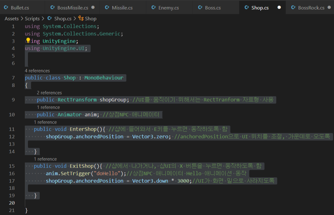 선언부 - RectTransform shopGroup; //UI를 움직이기 위해서는 RectTranform 자료형 사용