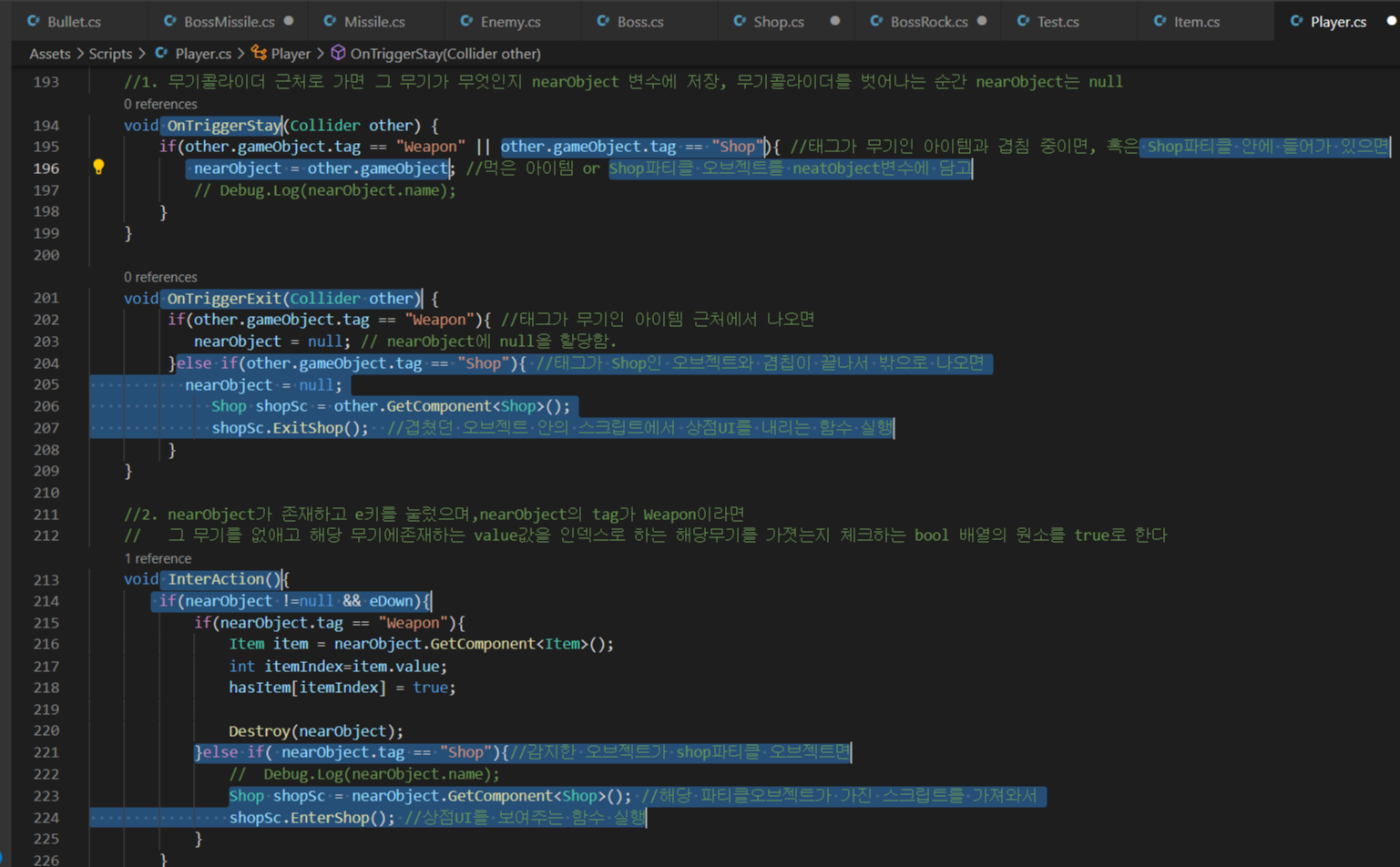 3) 플레이어가 상점파티클 안에 들어가서 E키를 누르면 상점UI가 나오고 벗어나면 사라지도록