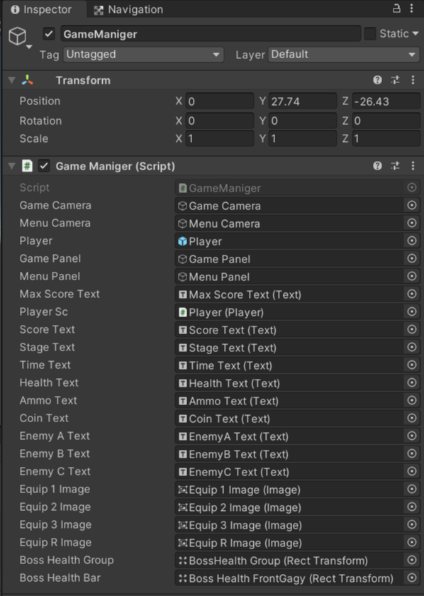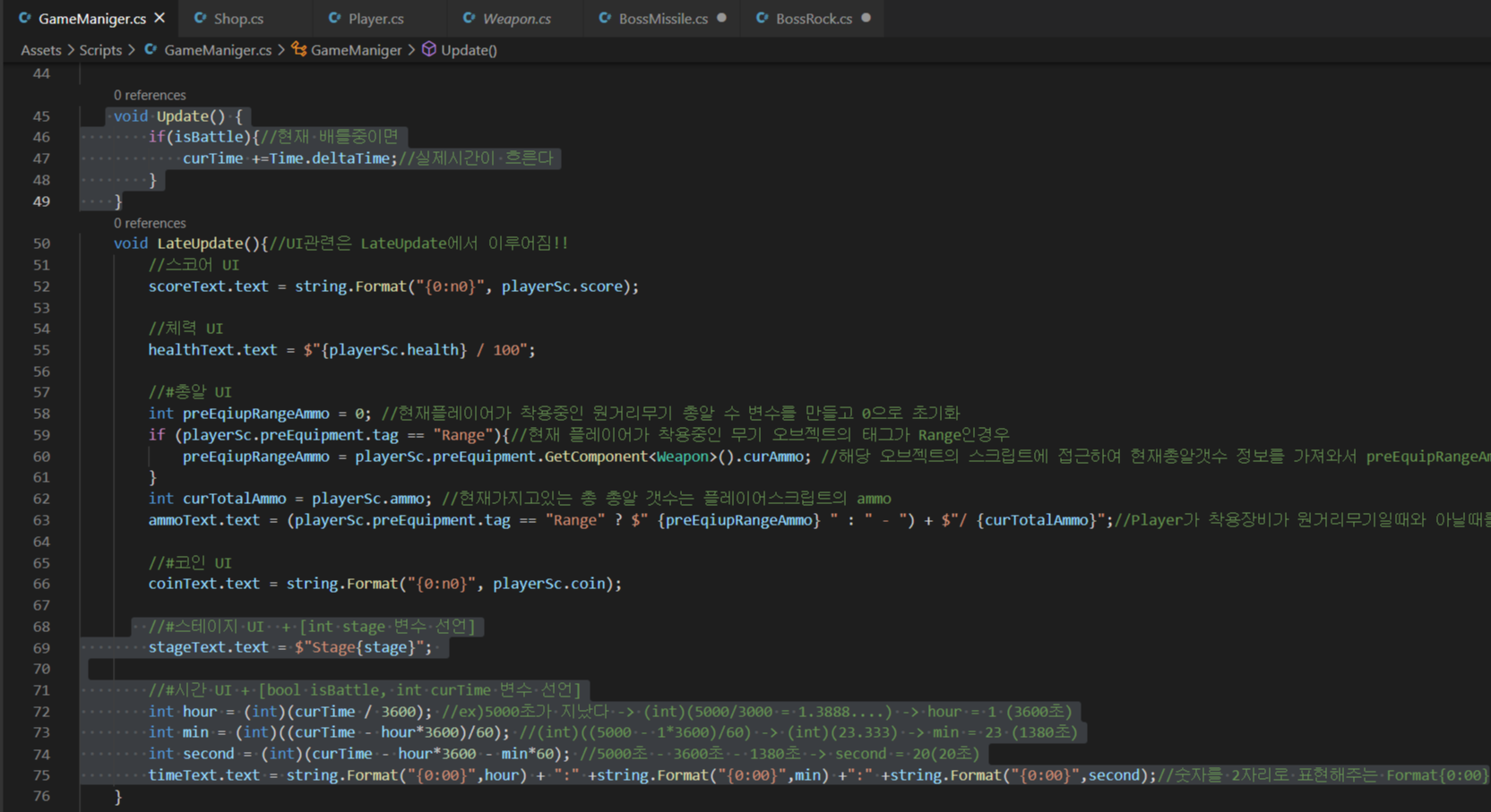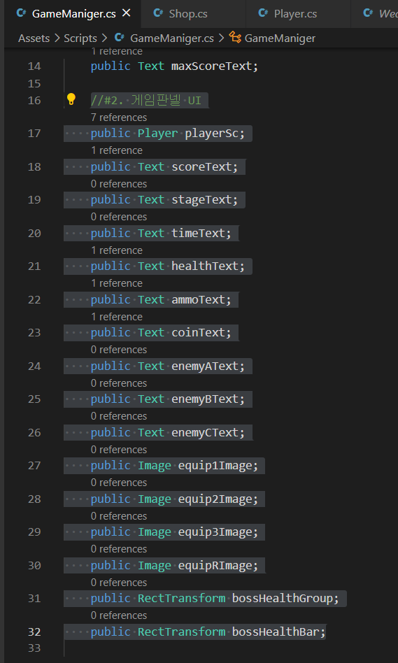 - 가져와야할 UI(변수) : scoreText, stageText, timeText, healthText, ammoText, coinText,