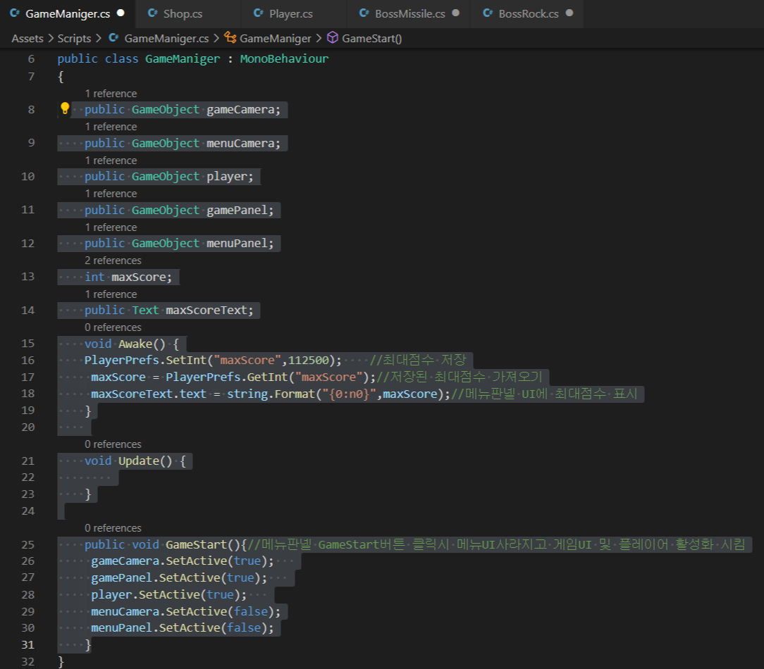 ①. 메뉴패널UI에 최대점수 표시, GameStart 버튼 클릭시 게임시작 구현