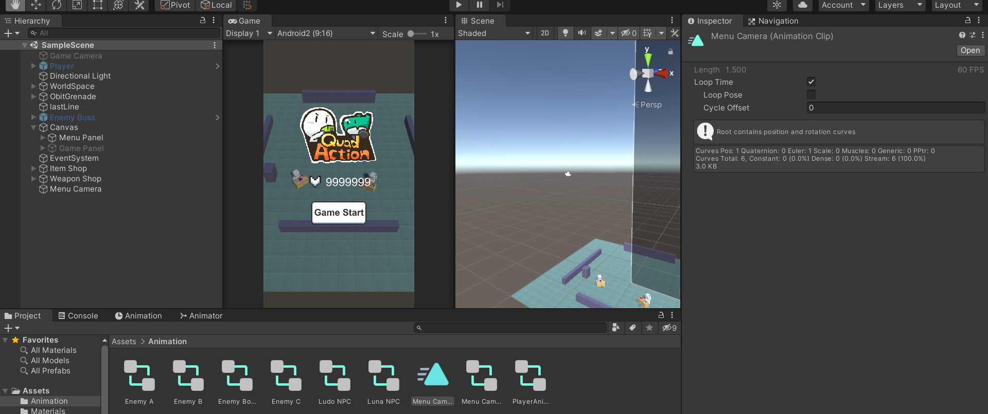- 비어있는 Animation을 생성하고 Menu Camera의 컴포넌트에 드래그 앤 드랍하면 Animator도 자동생성된다