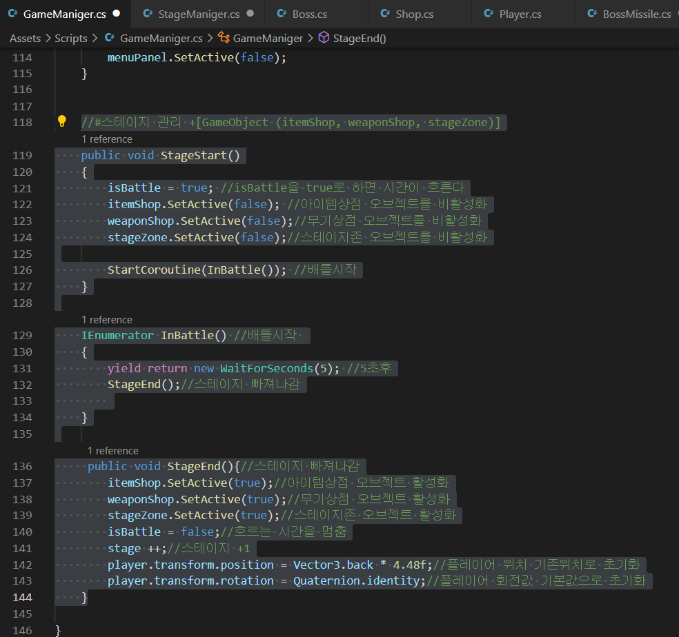- ①에서 StageManiger의 OntriggerEnter이벤트에 의해 아래의 GameManiger스크립트의 StageStart()함수가 실행됨