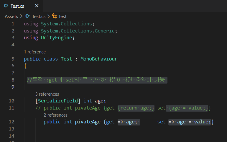*아래처럼 축약하면 Test의 public int Age가 실제로는 private int Age변수 역할을 하게되어