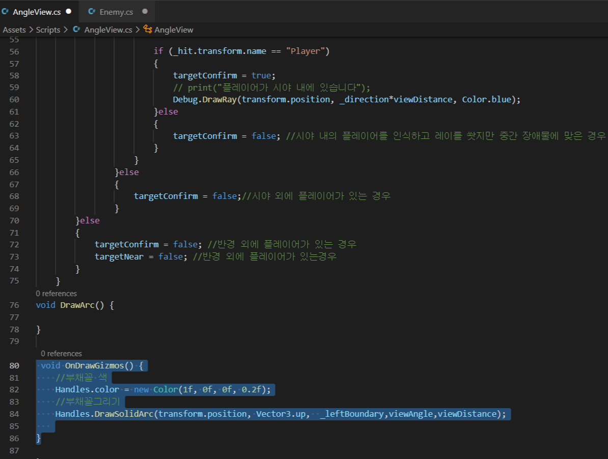 *Handles를 쓰기위해선 상단에 using UnityEditor;가 네임스페이스가 필요함