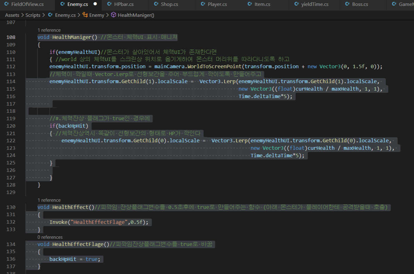 - backHpHit플래그변수는 몬스터가 피격당할때 0.5초 후에 true바꿔주고 바로 false로 복원시키는 방식으로 몬스터 피격시 1회성으로 호출되도록 구현