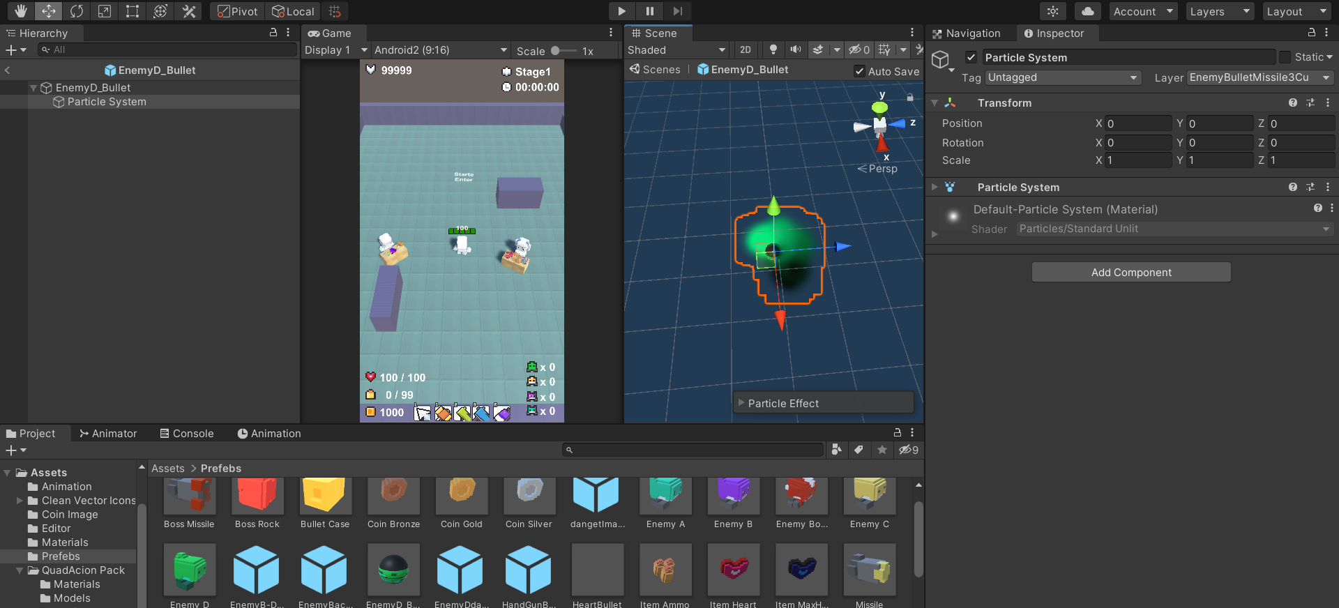 - 파티클 시스템을을 가진 일반 원형총알 오브젝트를 프리팹화 해준다, bullet 스크립트를 추가해주고 총알 Type을