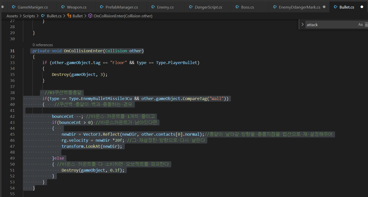 - OnCollistionEnter 이벤트 함수를 이용하고, 충돌지점의 법선인 contacts[0].normal을 이용하여 Vector3.Reflect를 이용하여 새롭게 속력을 줄 방향을 새로 지정해주는 방식으로 bounceCnt만큼 총알을 발사해준다