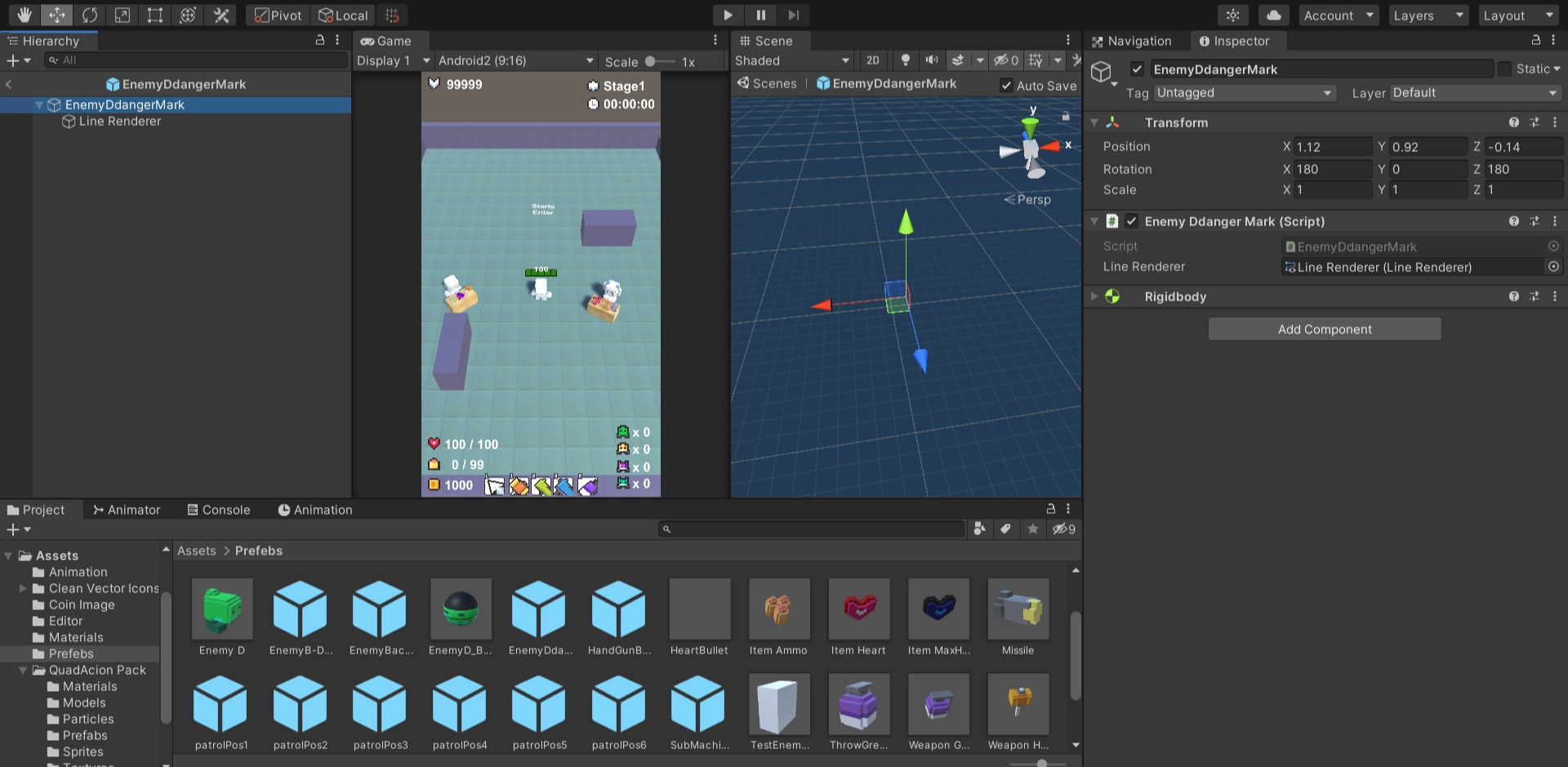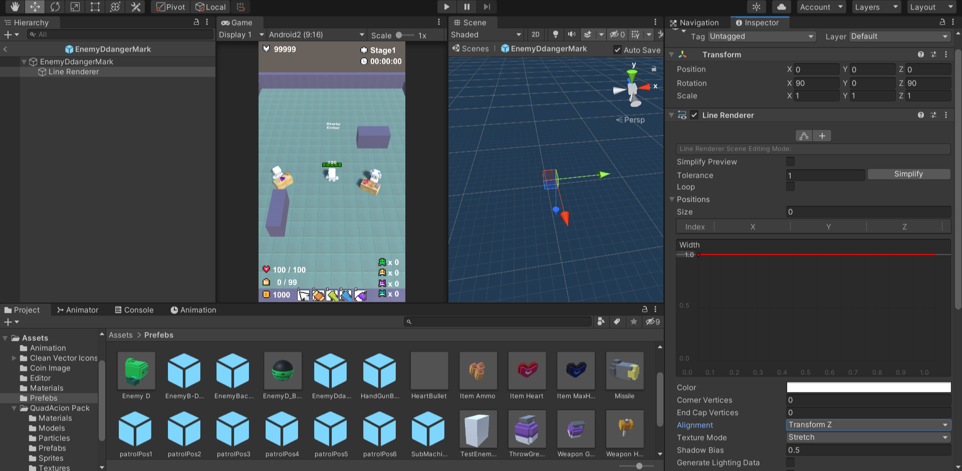 - 부모오브젝트로 생성한 EnemyDdangerMark 오브젝트에 이 후 만들어줄 EnemyDdangerMark스크립트를 컴포넌트에추가해주고 위에서 만든 라인렌더러 오브젝트를 Line Renderer에 드래그 앤 드랍한다
