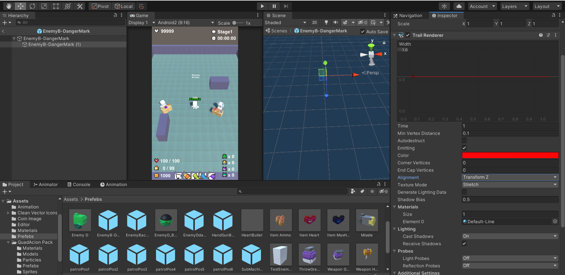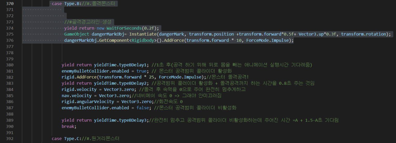 - 기존 Enemy 스크립트의 Attack()함수안에서 Type.B의 공격에 대한 코드에 위에서 만든 트레일랜더러 프리팹을 생성하고 앞으로 rigid.AddForce() 날려주는 코드를 추가한다(이 후 Destroy되도록 해줌)