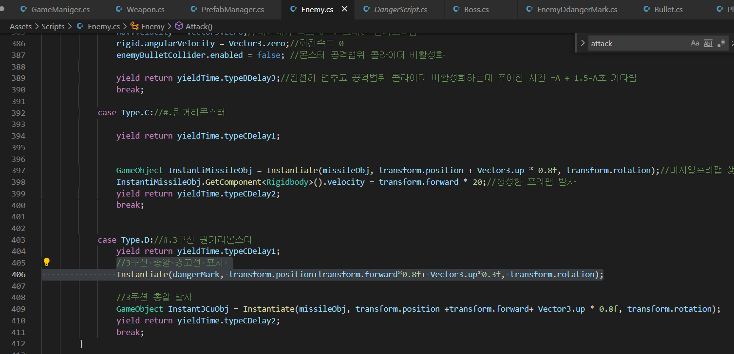 - Enemy 스크립트에서 Attack()안에 있는 Type.D의 공격방식 코드에 해당 몬스터가 공격시에 위에서 만든 라인렌더러가 들어간 부모오브젝트 프리팹을 생성하도록 Instantiate해준다