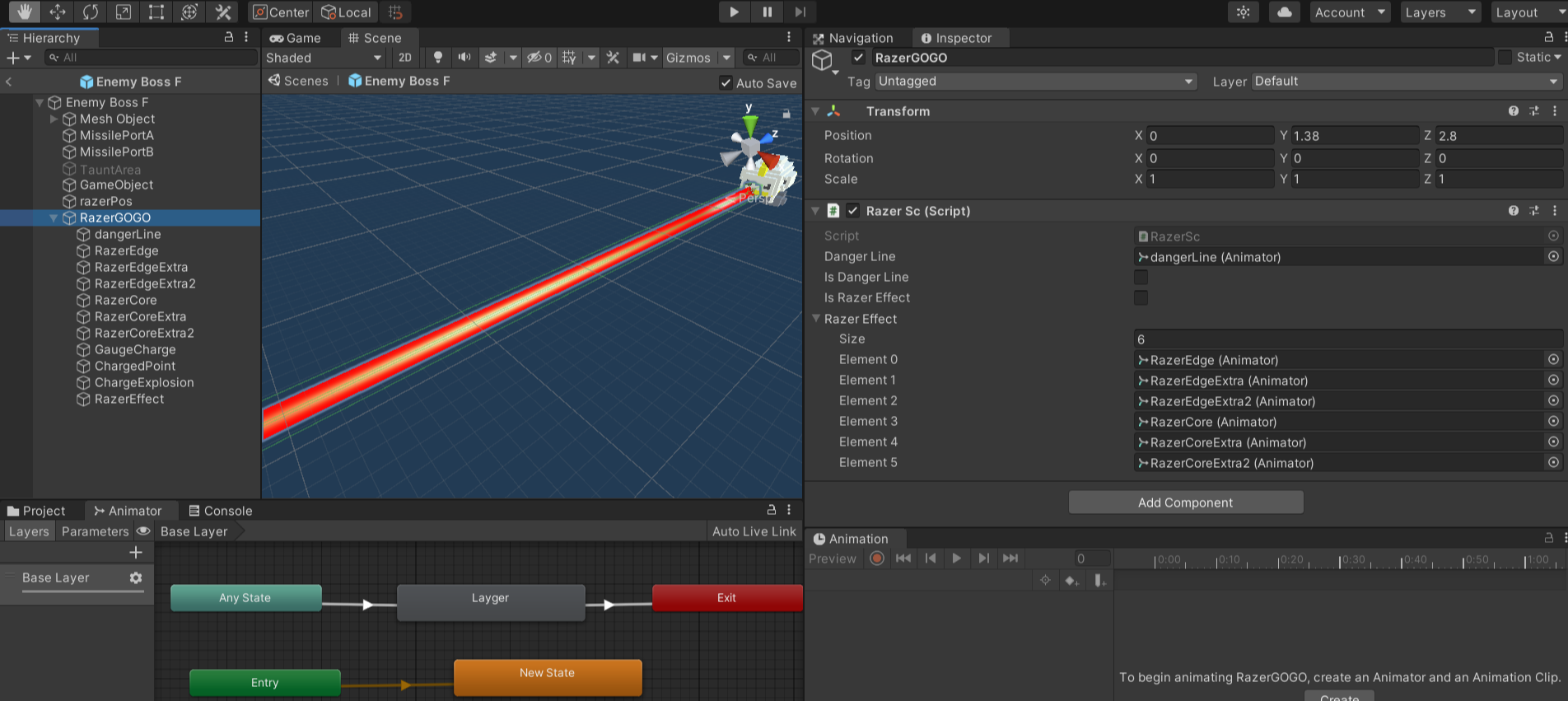 과정에서 경고선과 달리 실제 레이져 이펙트를 담당하는 애니메이션을 가진 여러 레이저 관련 자식 오브젝트