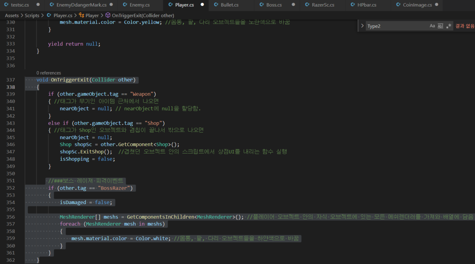 - Player 스크립트의 OnTriggerExit()에서는 위 레이저오브젝트에서 벗어나면 is damaged를 false로 하고