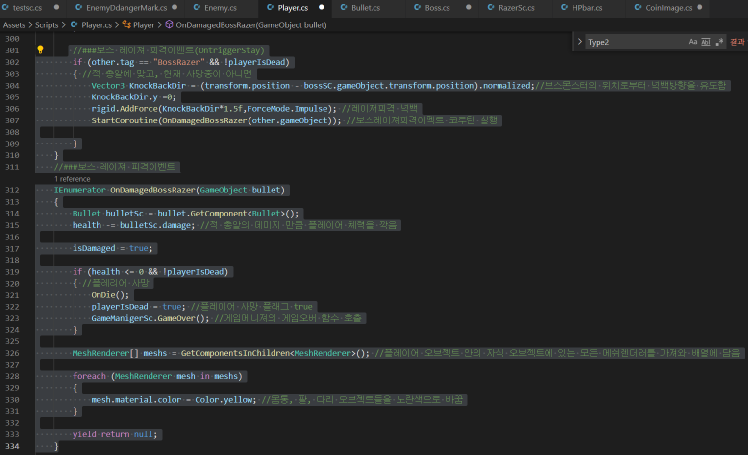 - Player 스크립트의 OnTriggerStay()에서 만약 플레아어가 위에서 만든 레이저오브젝트의 RazerEdge
