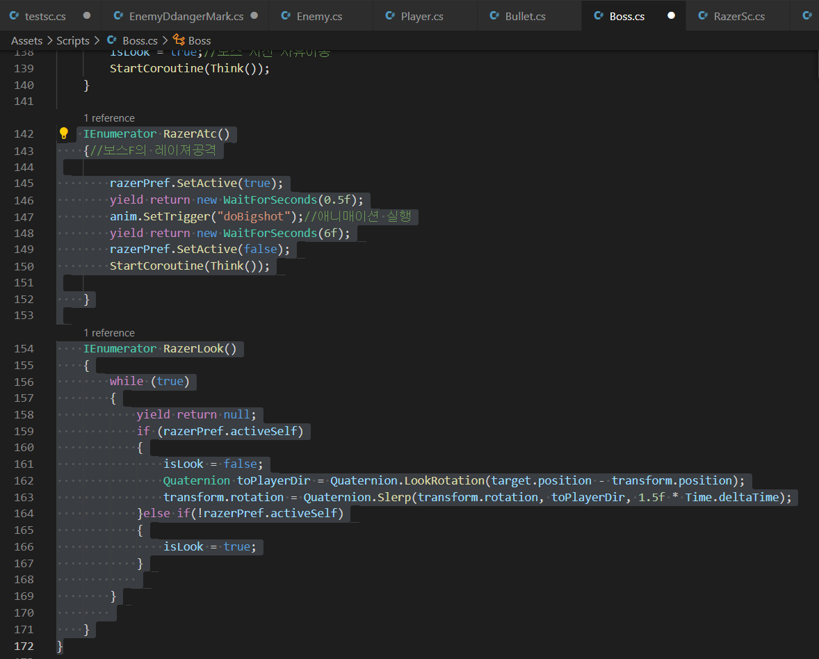 - 보스가 레이져를 발사하면서 천천히 플레이어를 바라보도록 Quaternion.Slerp()를 활용하여 구현해준다