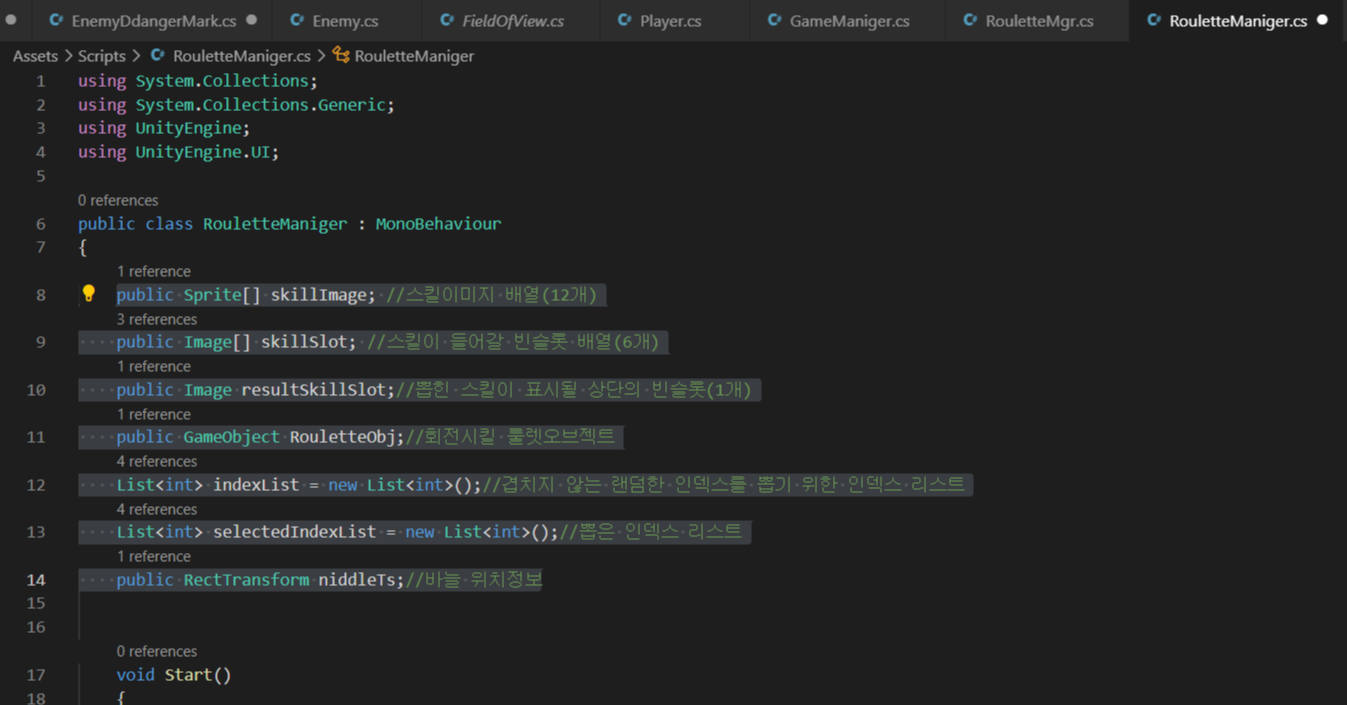 - 스킬이미지 갯수만큼의 인덱스가 들어있는 indexList를 만들고 해당 리스트에서 인덱스에 해당하는 숫자를 랜덤하게 뽑아서 selectedIndextList에 넣어주고 뽑은 숫자는 indexList에서 지워주는 로직