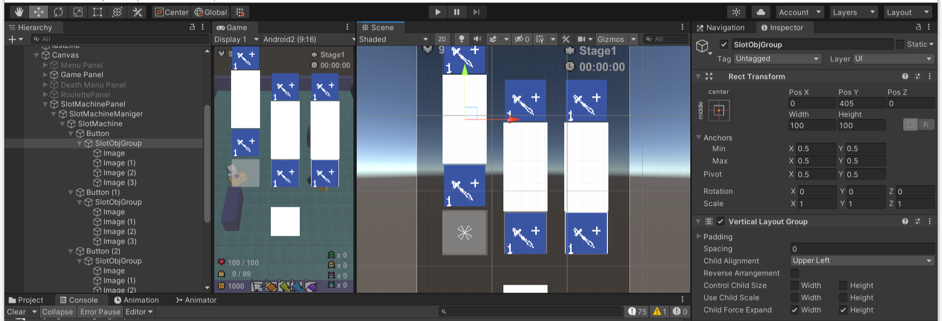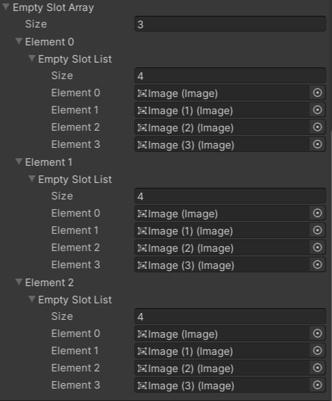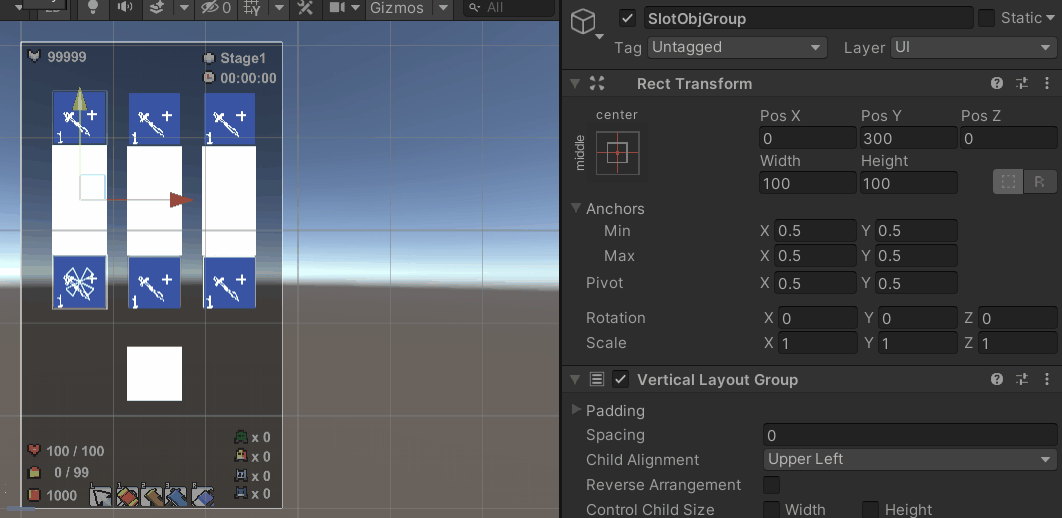 - Button UI 아래 빈 오브젝트인 SlotObjGroup아래 4개의 Image를 만들고 Vertical Layout Group 컴포넌트를 주어