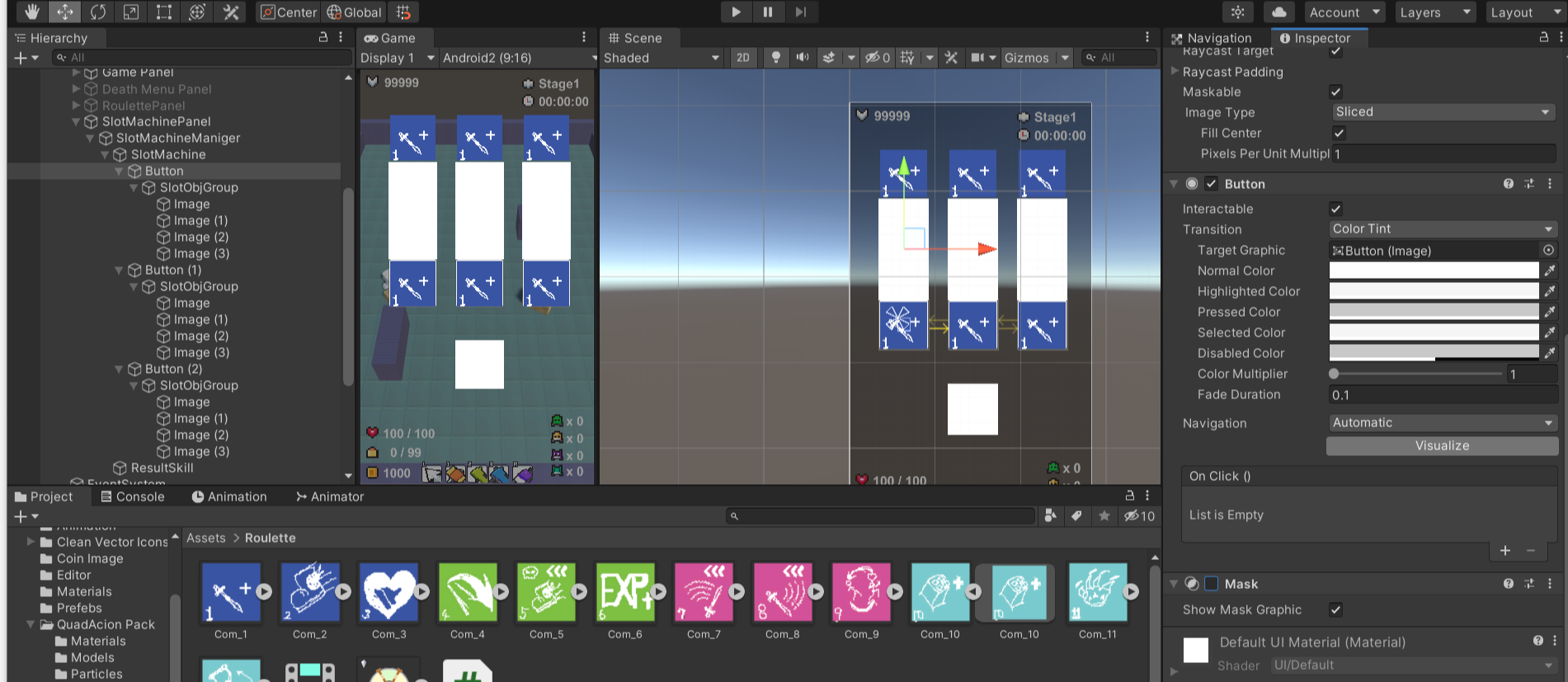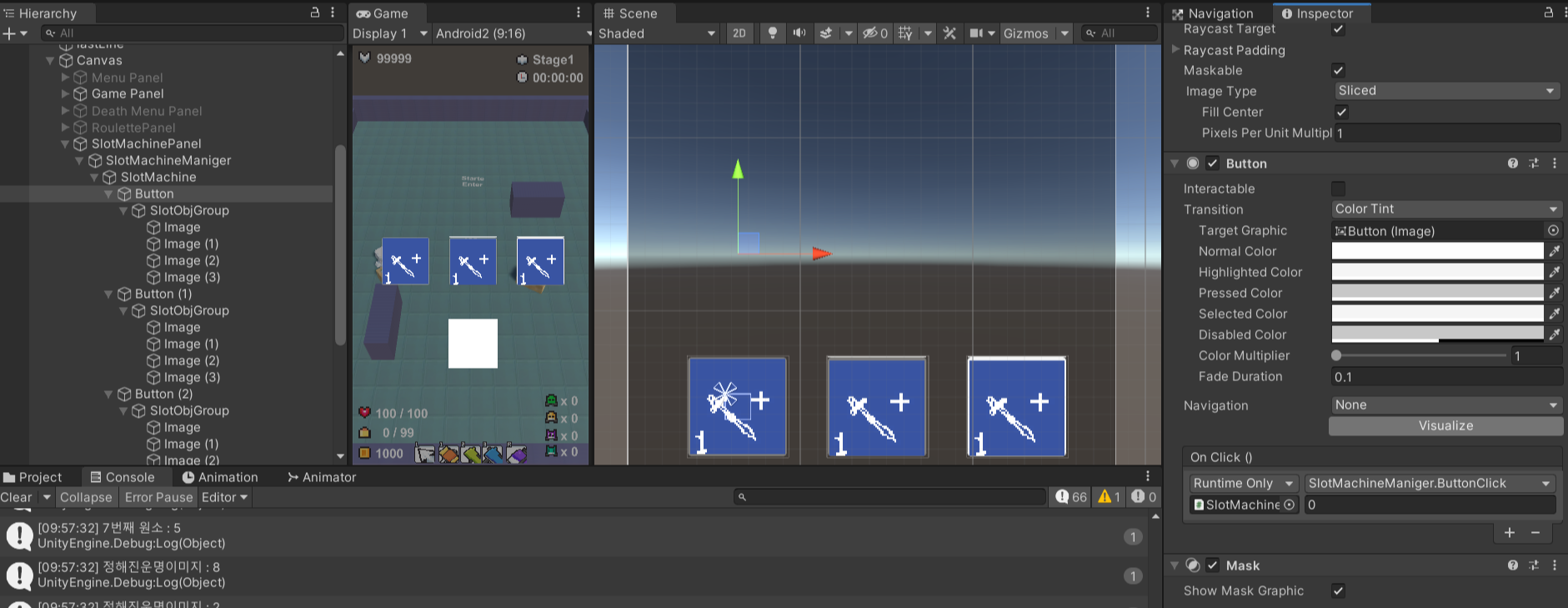 - 3개의 Button들을 그 부모 빈오브젝트인 SlotMachine 오브젝트에서 컴포넌트로 Horizontal LayOut Group을 주어 가로로 정렬시킴