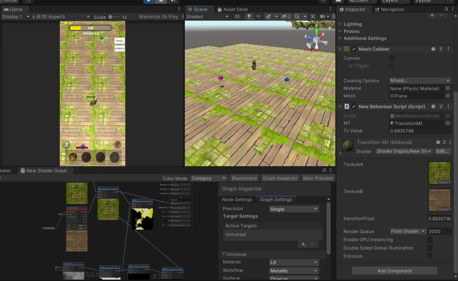 - Stage1 보스클리어 후 Stage2로 넘어갈때 맵의 Material이 점진적으로 transition되도록 쉐이더를 적용시키기 위해 샘플Plane 오브젝트를 생성하여 적용시킴