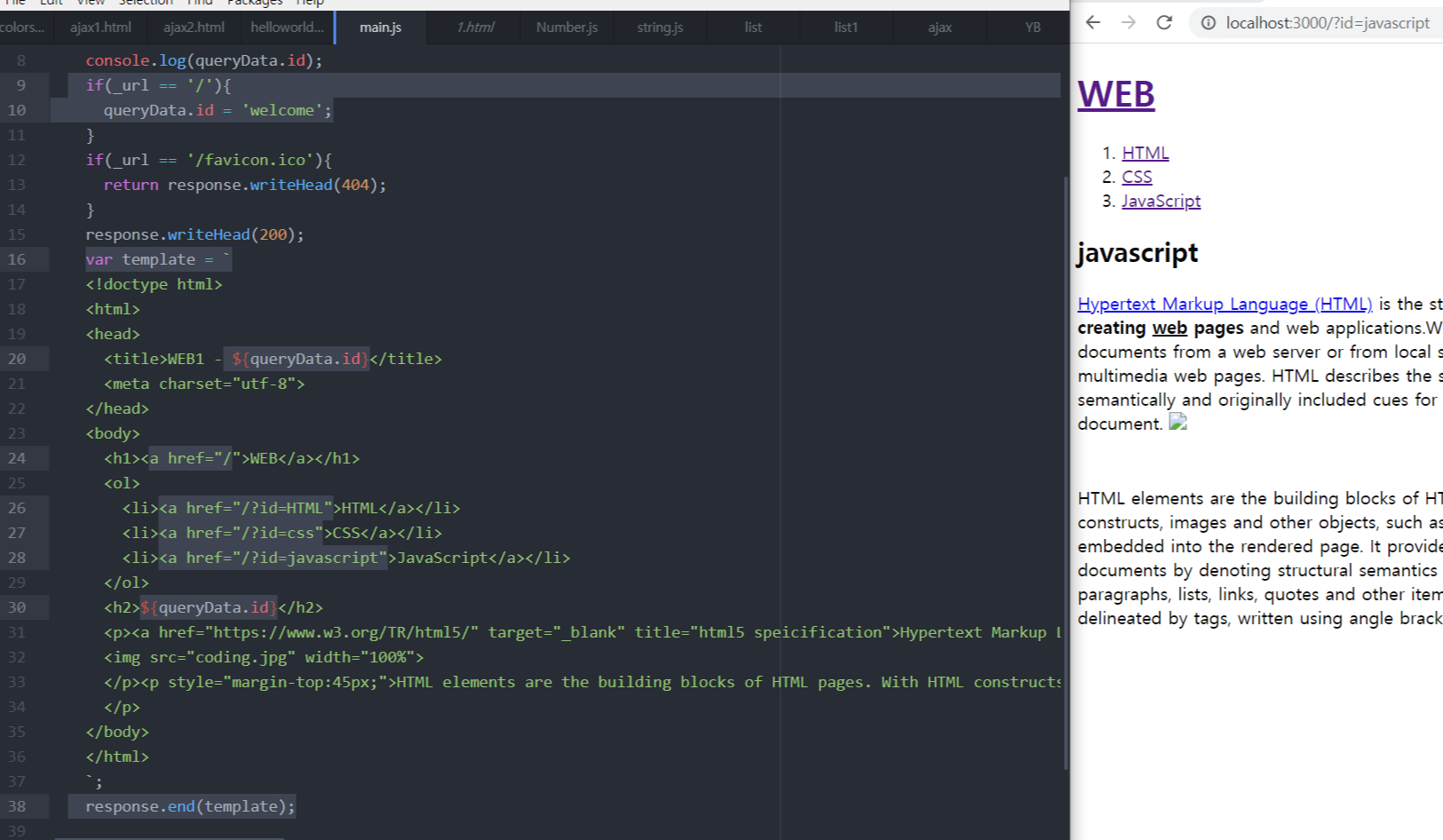 5. var queryData = url.parse(_url, true).query;에 의해서 주소창의 /?id=HTML이 {id : HTML} 즉 객체의 형식으로