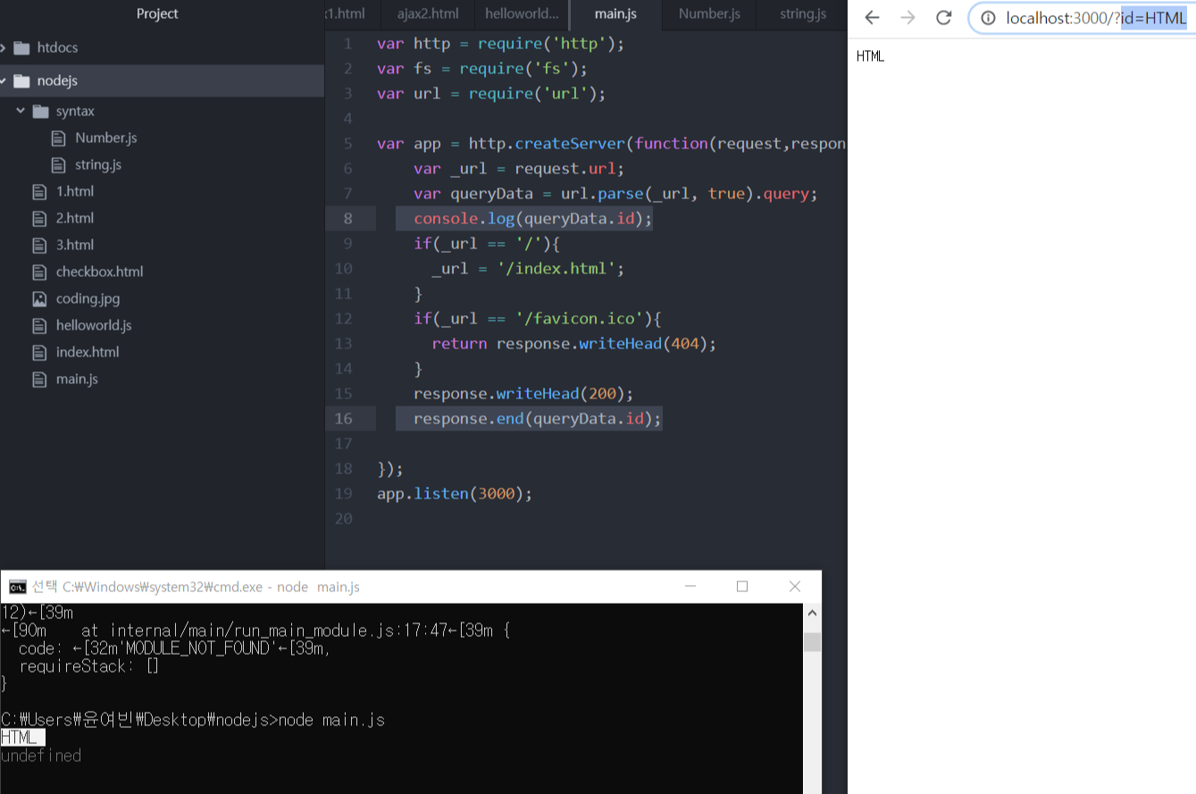 2. 따라서 주소창의 query srting을 main.js에 코드로써 추출해오고싶다 그리고 node.js로 실행을 하면 끝