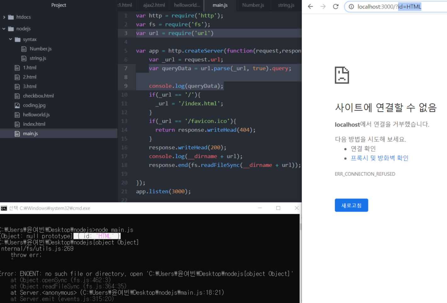 *var _url = request.url;는 주소창의 / 이후 주소를 가르킨다 ex)/?id=HTML