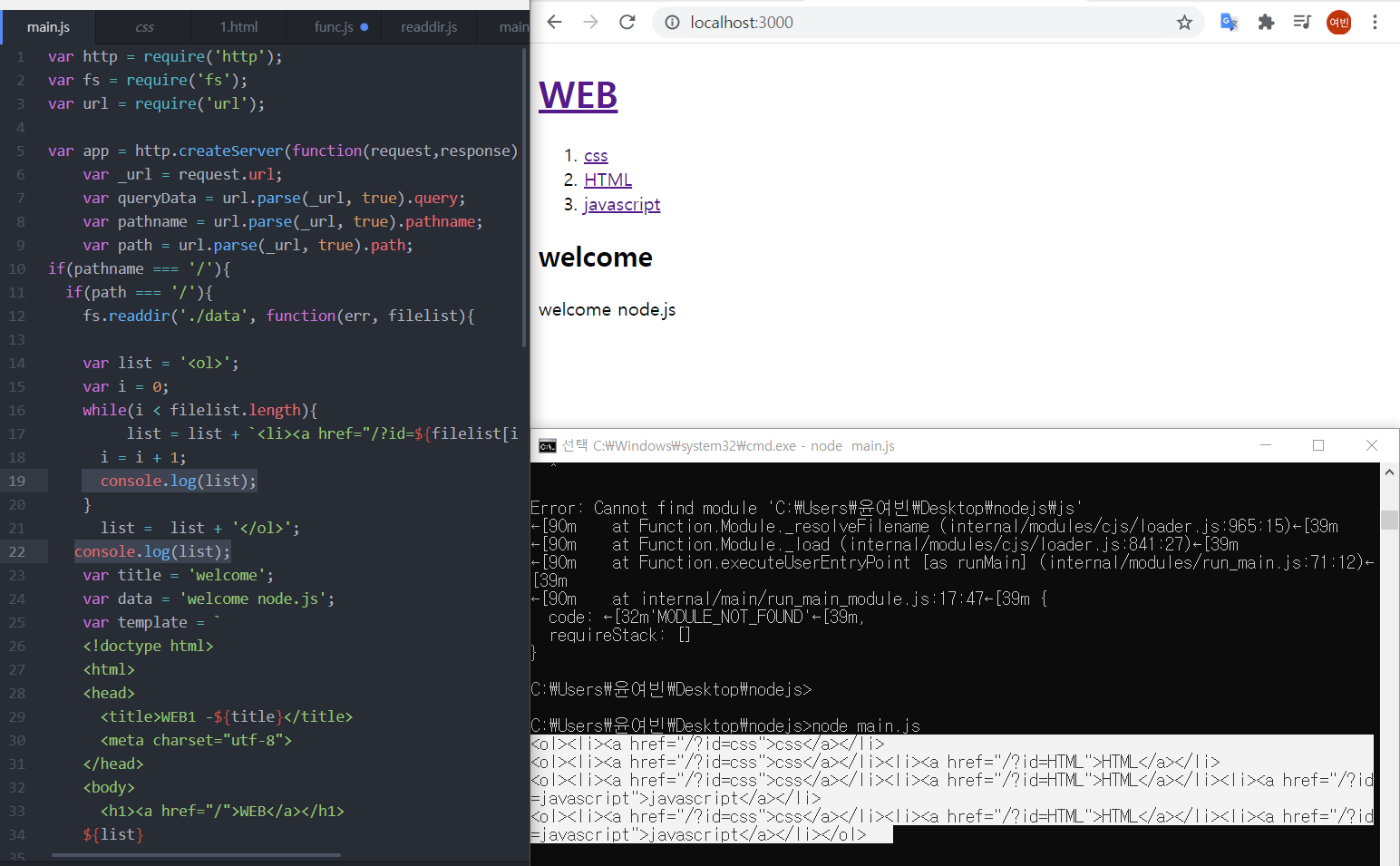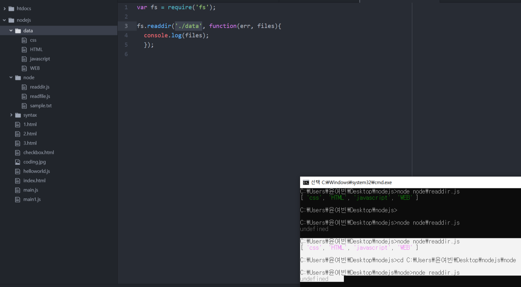 따라서 위 예제의 cmd창에서 첫번째 경우 node를 실행하는 디렉토리가 nodejs폴더이기 때문에 그 디렉토리에 존재 하는 data폴더를 가져온다는의미로 ./를 쓴것이고두번째 경우 node를 실행하는 디렉토리가 node폴더이기 때문에 node폴더 안에는 data폴더가 없기때문에 ./로는 가져오지 못하는 것이다.
