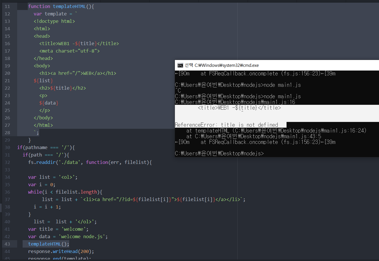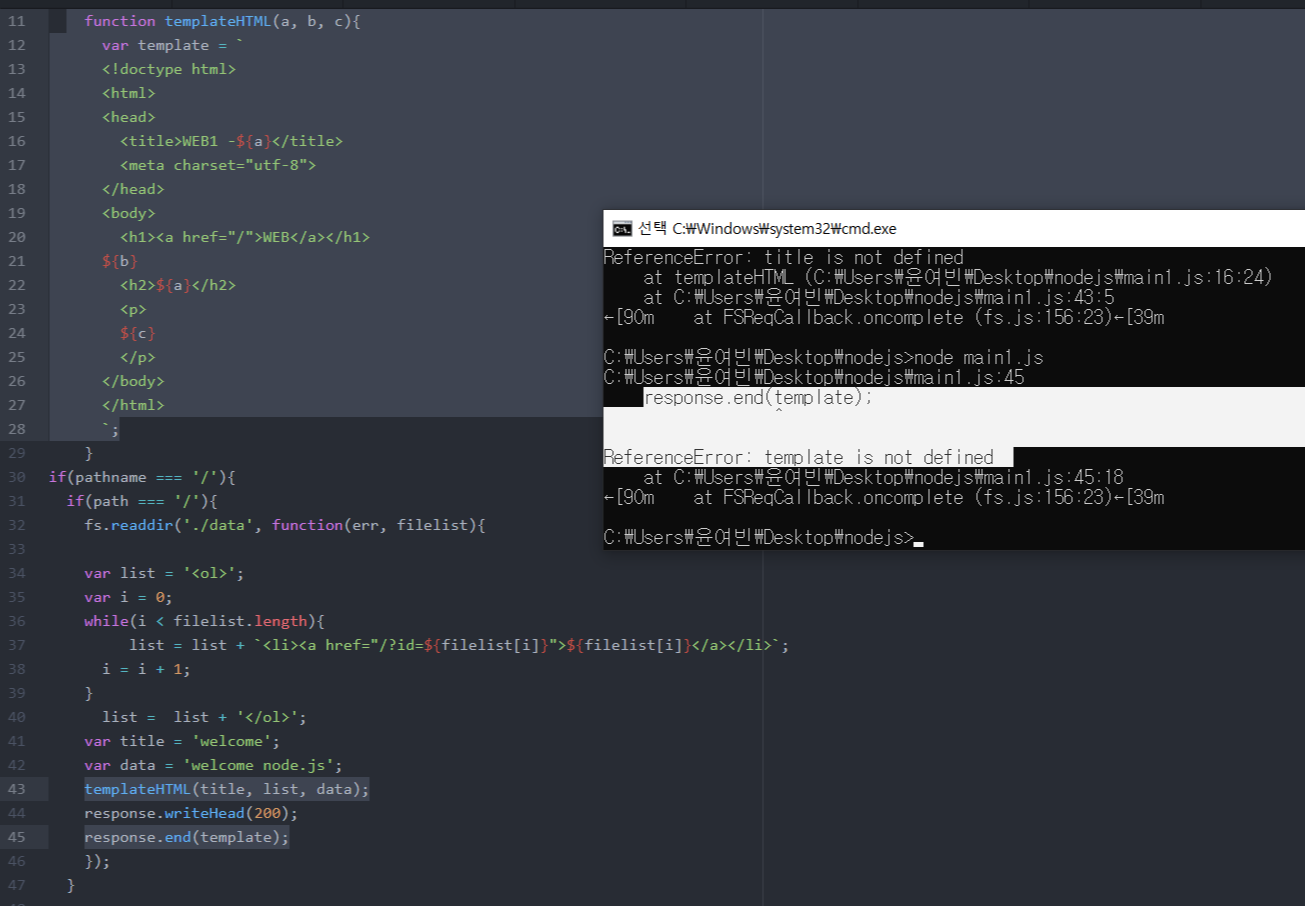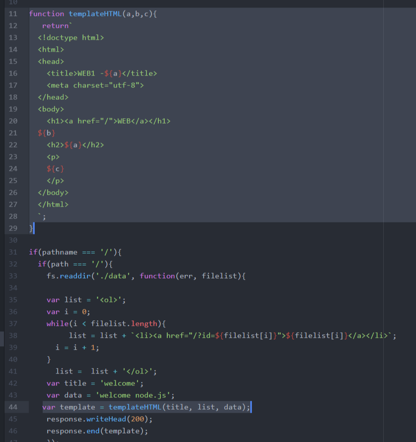 var template=`~~`가 있던 43번째줄을 통으로 templateHTML()이라는 함수로 대체하려고 해봤다