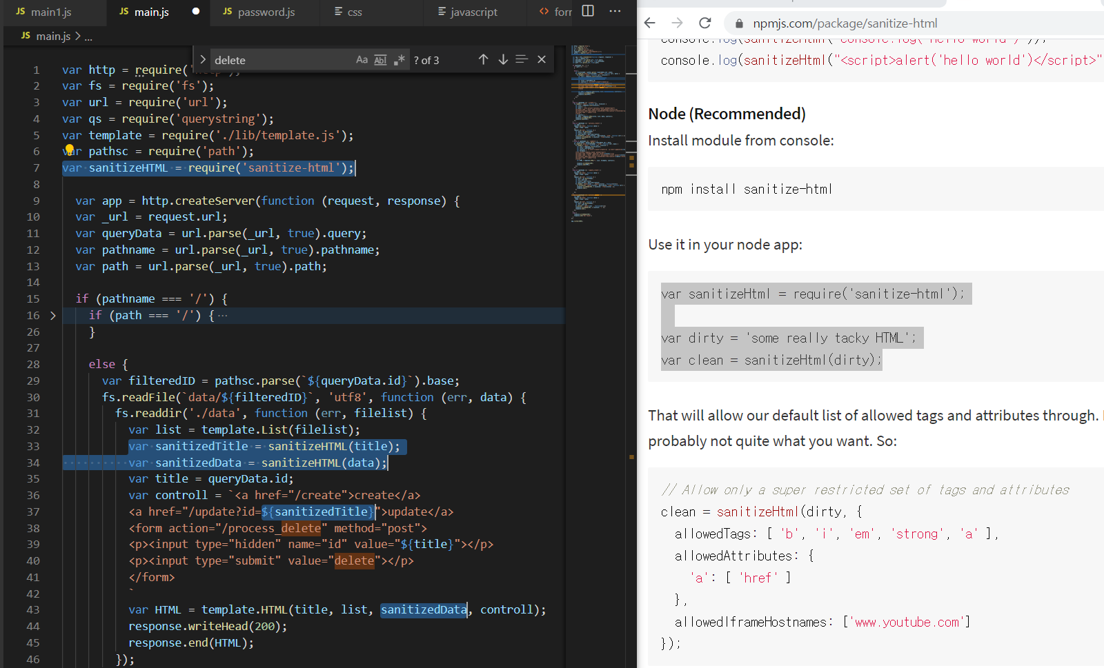 google 검색: npm sanitize(살균) html