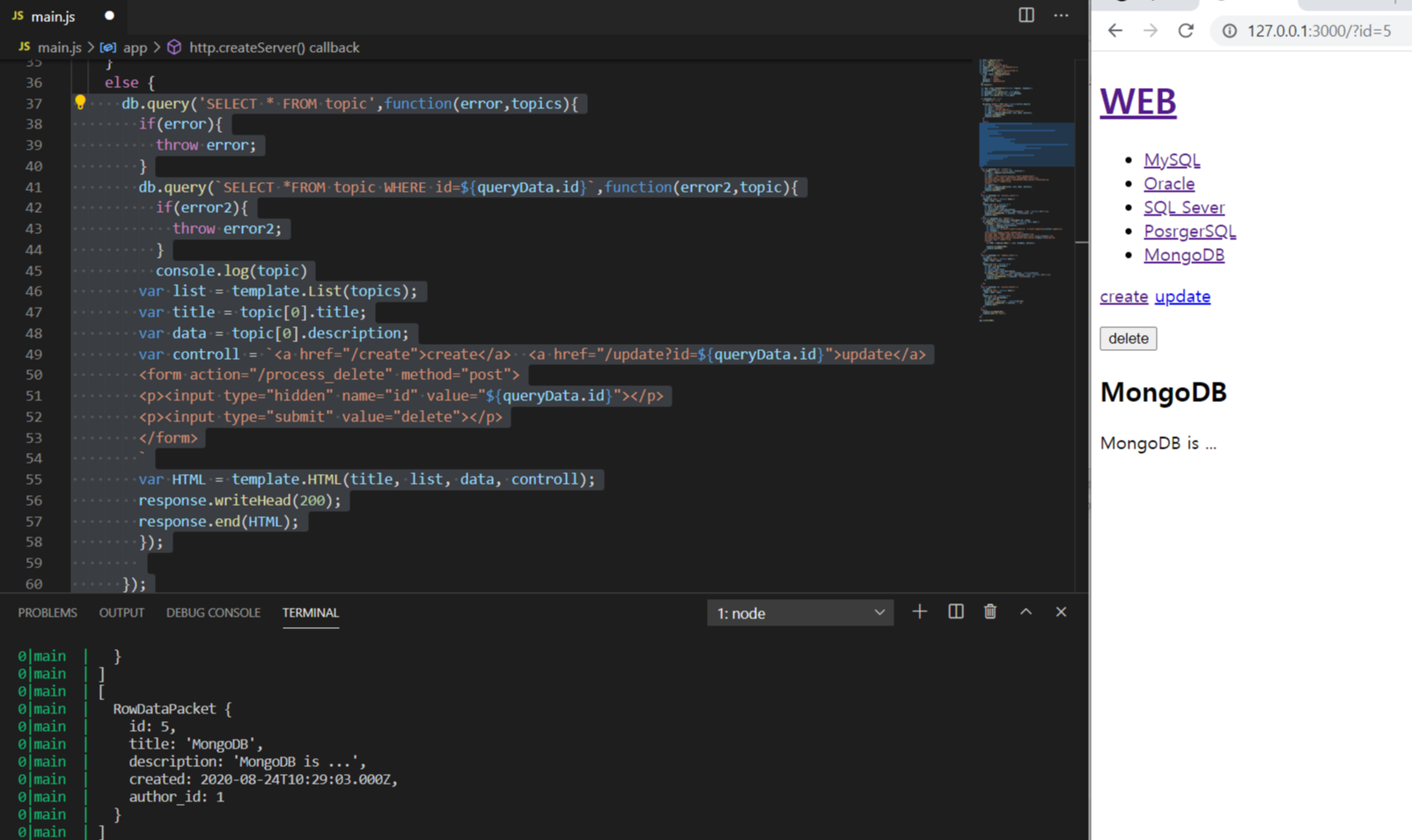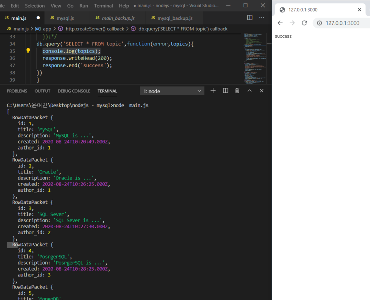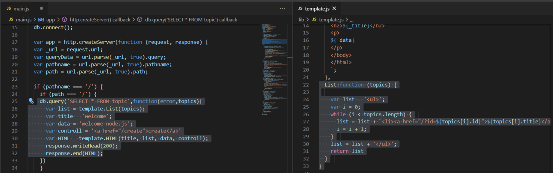 2. 그안에서 db.query('SELECT * FROM topic WHERE id=?`,[queryData.id],function(error,topics){}로 id값이 있을때 그 id값에 해당하는 table 1행을 가져오도록한 후(이는 배열안의 객체형식으로 가져옴)