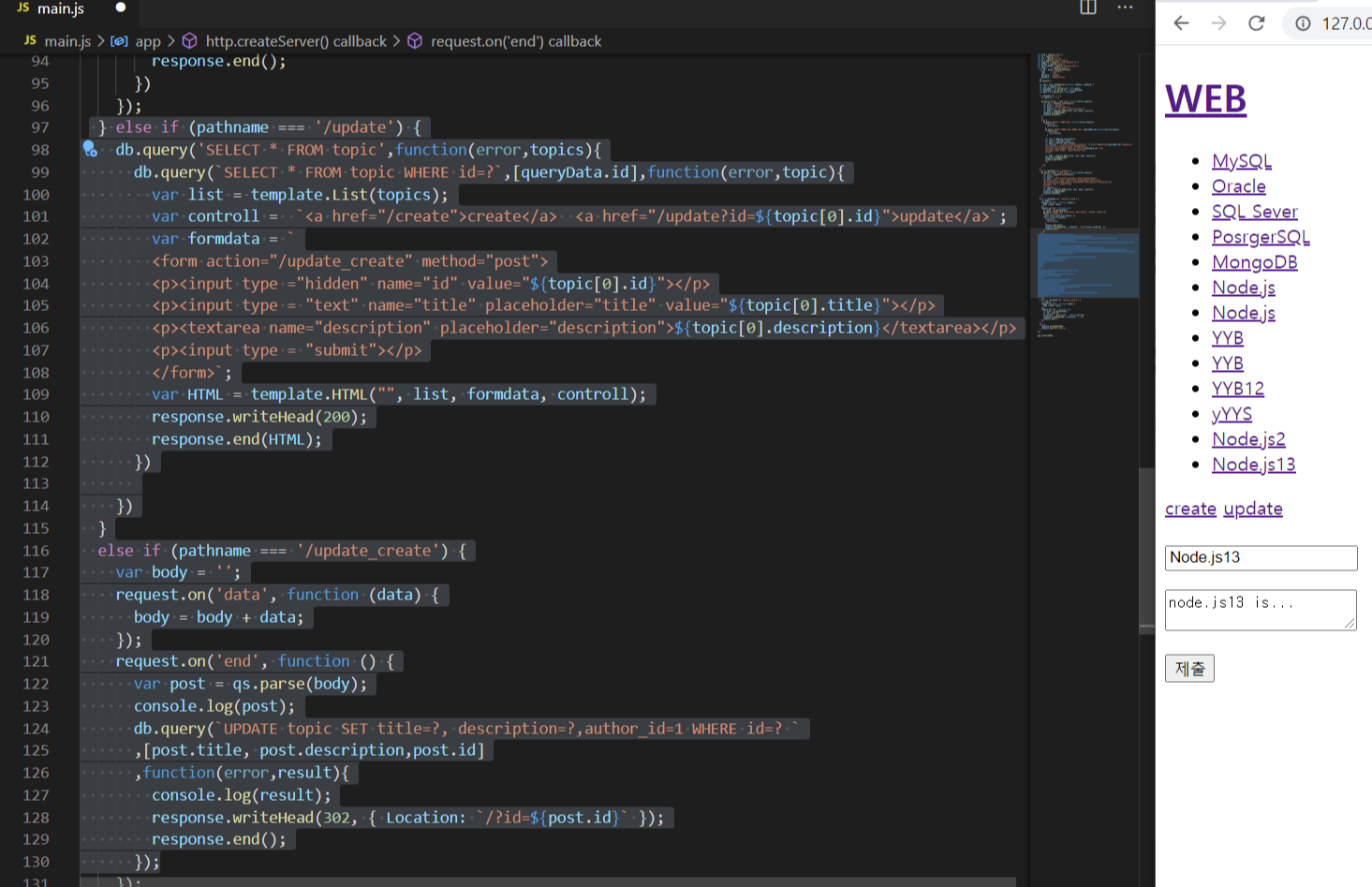 1. update를 클릭했을때 db.query('SELECT * FROM topic`,function(error,topics){}로 topic 전체 테이블을 가져오고