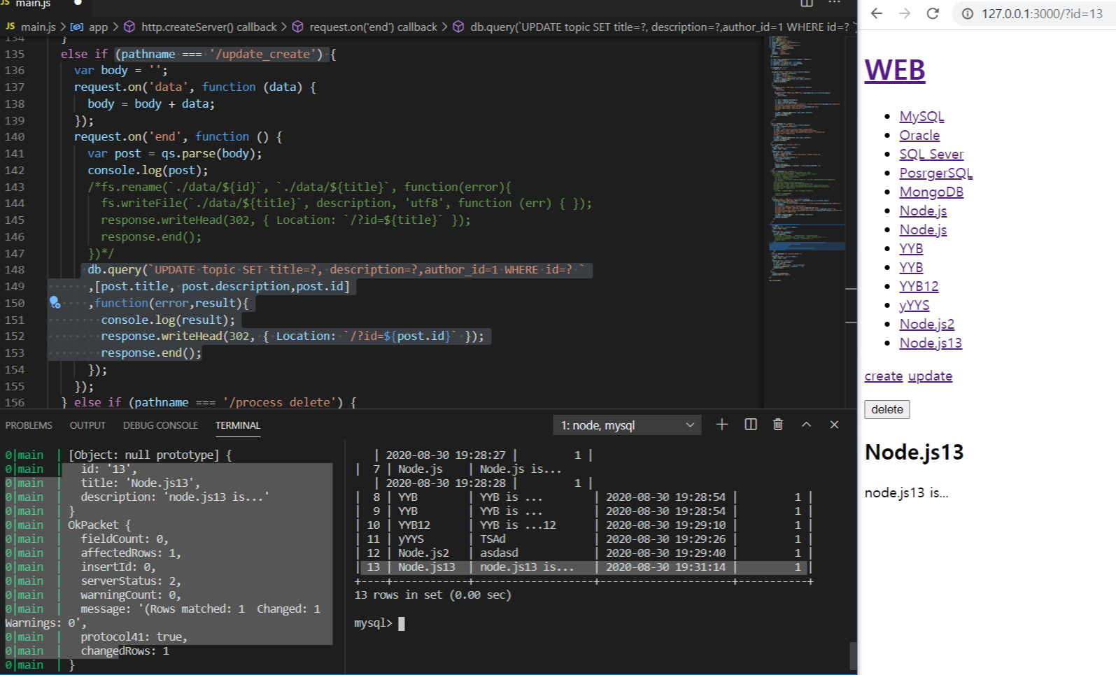 5.날라온 post정보를 잡아서 table의 정보를 바꾸는 sql문을 이용하여 정보를 바꾸고