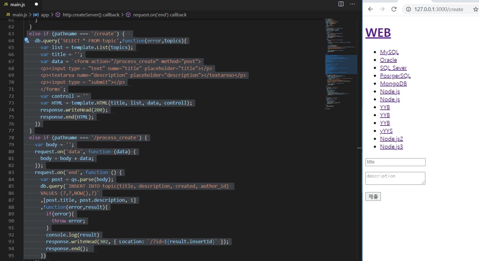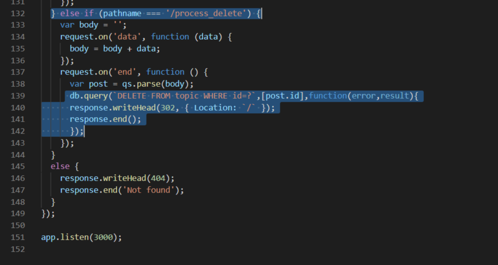 3. db.query의 첫번째 인자로 새로운 행을 추가하는 sql문 작성 INSERT INTO topic () VALUES ()