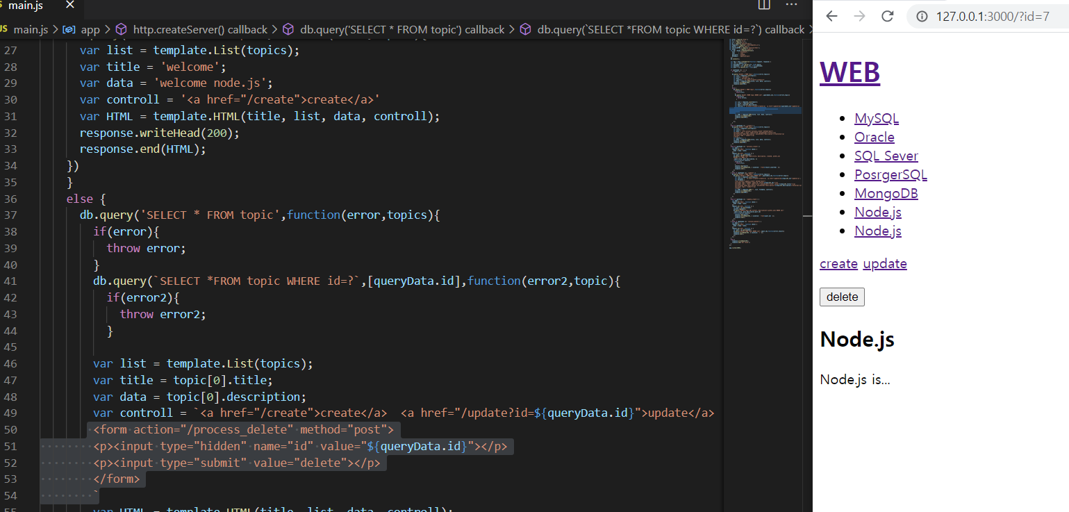 7. 그러면 id값이 있는 경우(http://localhost:3000/?id=result.insertId)의 본문구성으로 들어가 해당 화면 구성