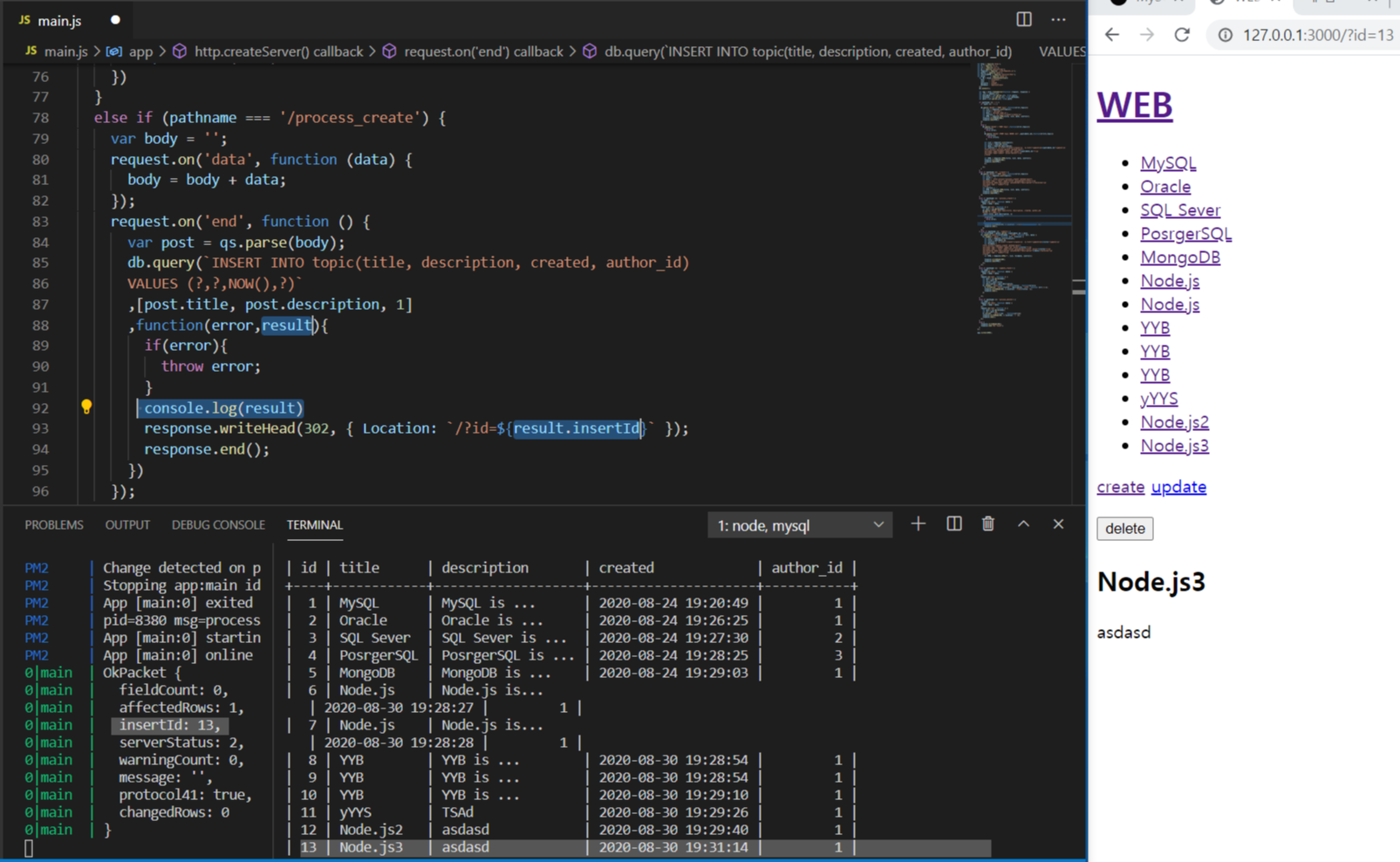 6. 콜백함수의 내용은 위 과정을 수행 후 3번째 과정에서 만들어져 삽입된 행의 id값(result.insertId)으로