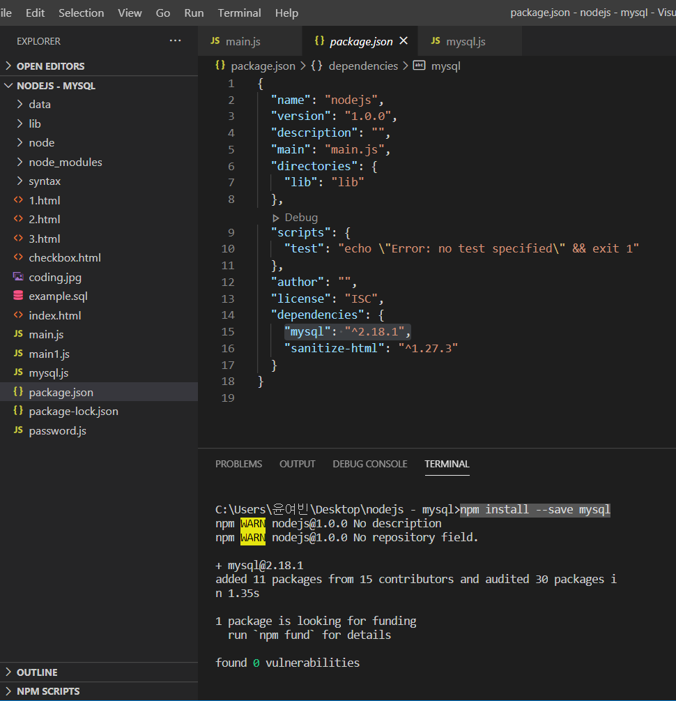 1. npm install --save mysql로 mysql package 설치하기