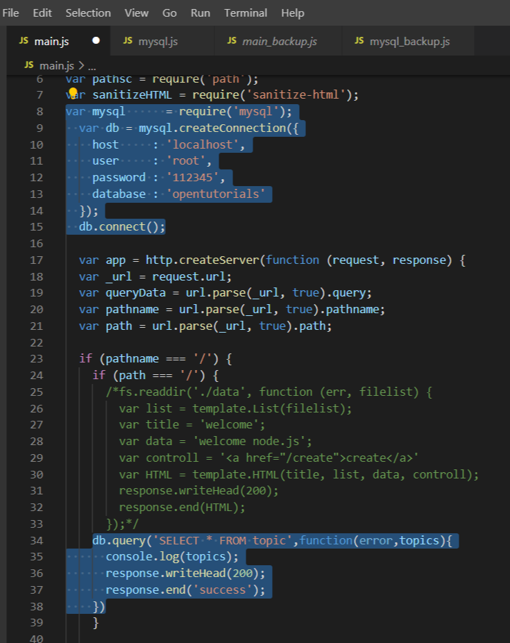 2. mysql.js 파일 생성후 node.js를 mysql client로써 사용할 수 있게 해주는 module을 불러오는 코드 작성 후
