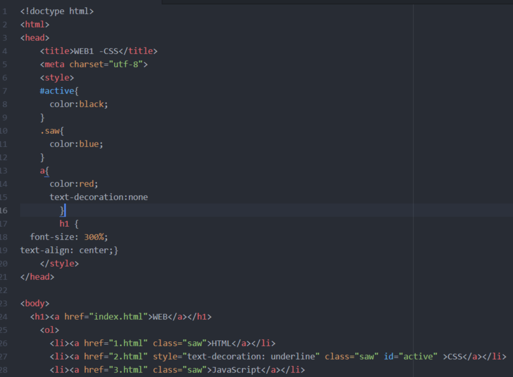 id>class>element(직접 tag를 지정하는 경우 예제1의 a{} selector)