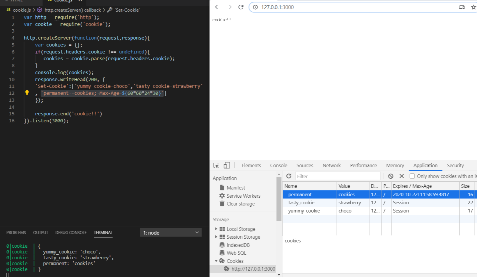 `쿠키name = 쿠키 value; Max-Age=${60*60*24*30}` -> permanent 쿠키 작성할때