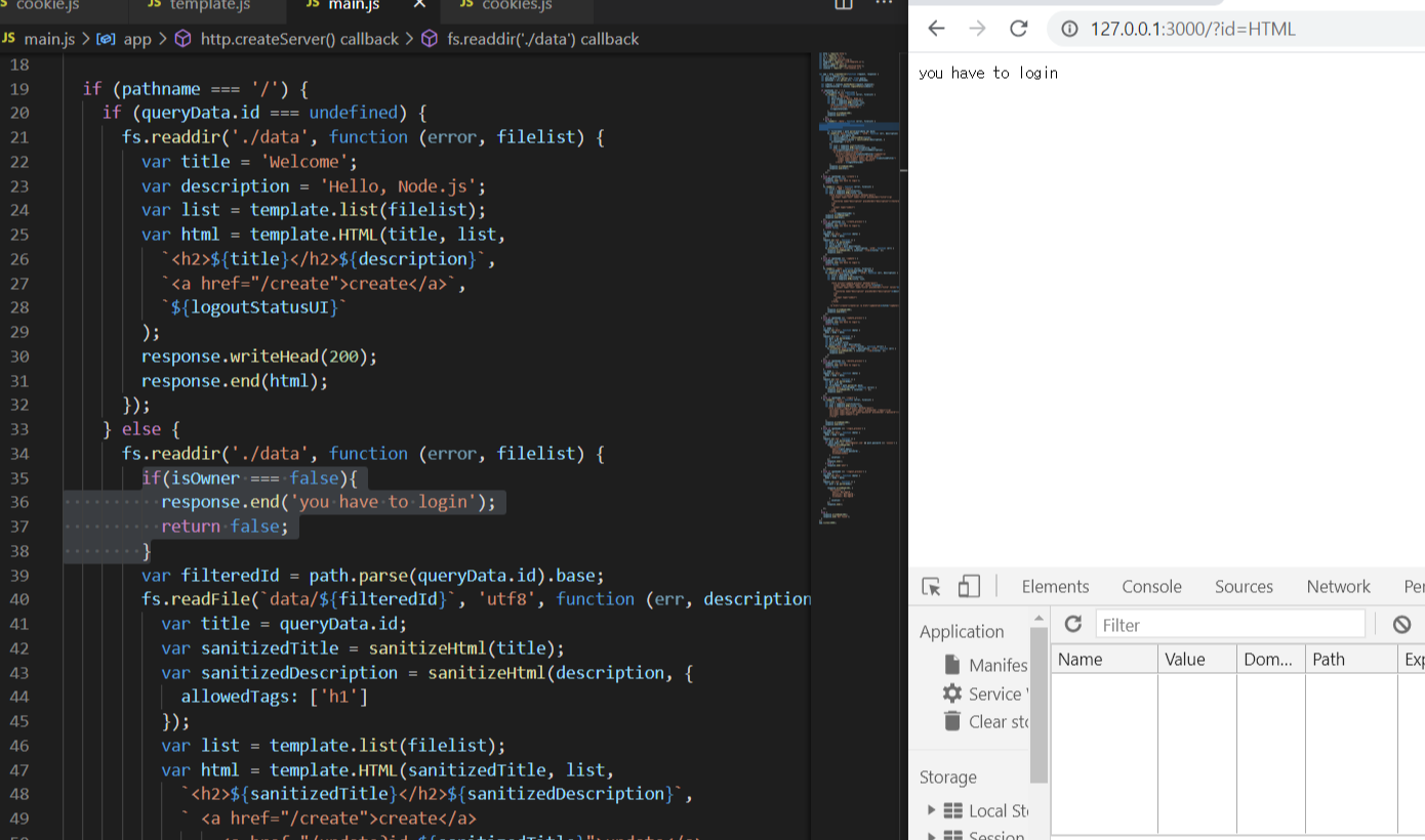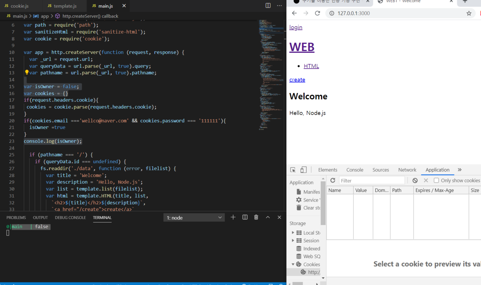 -1 cookie.js 에서 authIsOwner 함수에 의해서 로그인 성공여부에 따라 isOwner 가 true 인지 false 인지 리턴이 되고