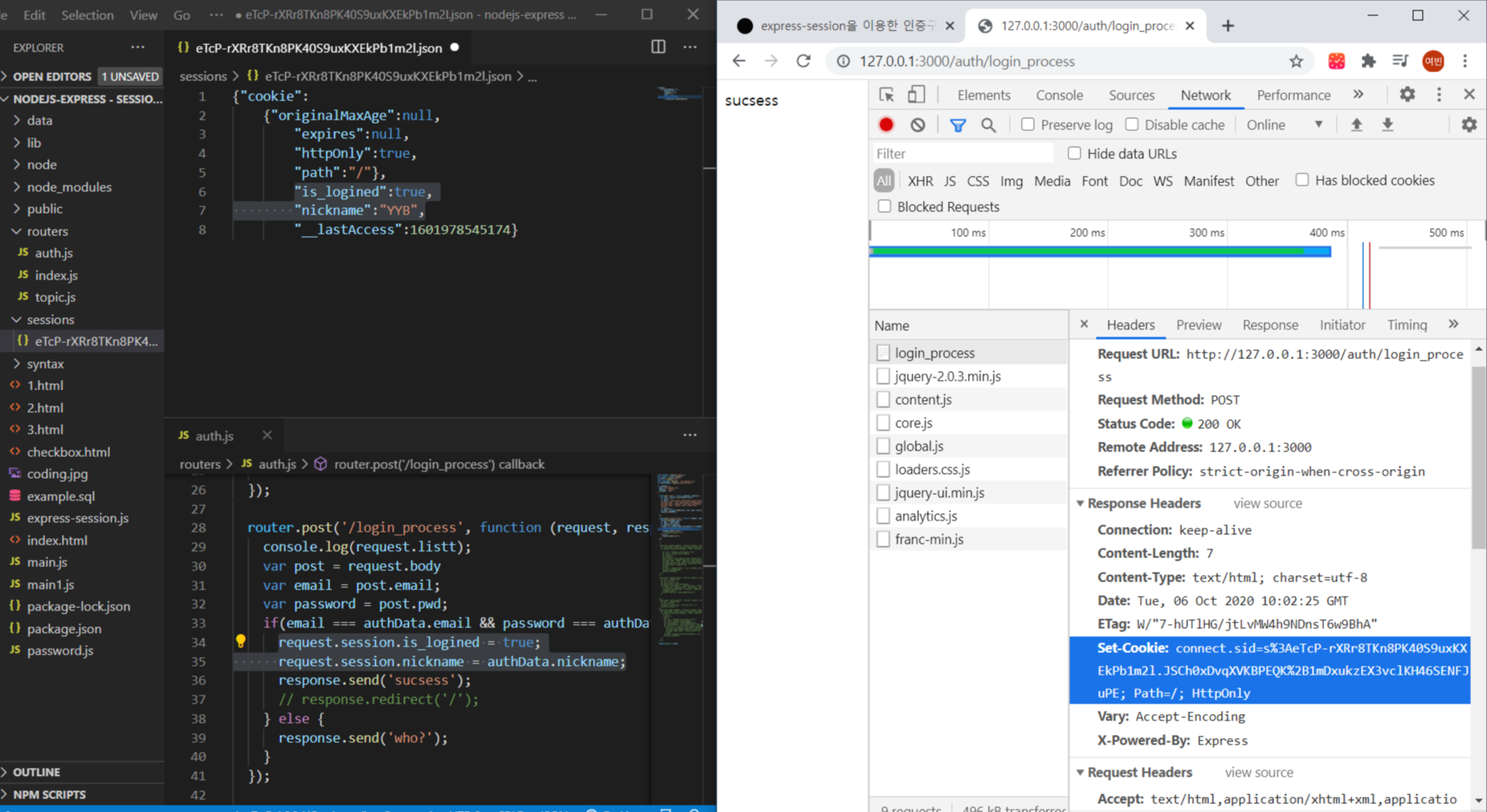 셋쿠키 : connect.sid~~~라는 세션의 식별자를 쿠키의 형식으로 웹브라우져에 박아놓고